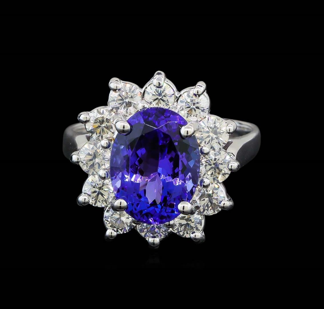 One electronically tested 14KT white gold lady's cast fashion ring with a basket halo with a bright polish finish. The featured lady's ring has a shank measuring 2.24 millimeters wide. Identified with markings of '14K'. Condition is new, good workmanship. Containing: One prong set oval modified brilliant cut natural tanzanite, measuring 10.85 x 8.26 x 5.90mm, (depth est.) approximate weight of 3.74ct., clarity is eye clean, medium dark, moderately strong, violetish blue color, (GIA vB 6/4), cut is very good. Transmitting light with no distortion, transparent. Colored gemstones are presumed to have been subjected to commonly used enhancement processes. Graded in the setting. Twelve prong set round brilliant cut diamonds, measuring 3.10 - 3.00 x 1.83mm (depth est.) approximate total weight of 12 Stones = 1.25ct. Graded in the setting. Clarity VS-2 to SI-2. Color: H - J Cut Very Good. Total Weight of Colored Stones 3.74ct.. Total Weight of Diamonds 1.25ct.. Total Weight of Ring 6.10gm. GAS Appraised at $10,555.00.
