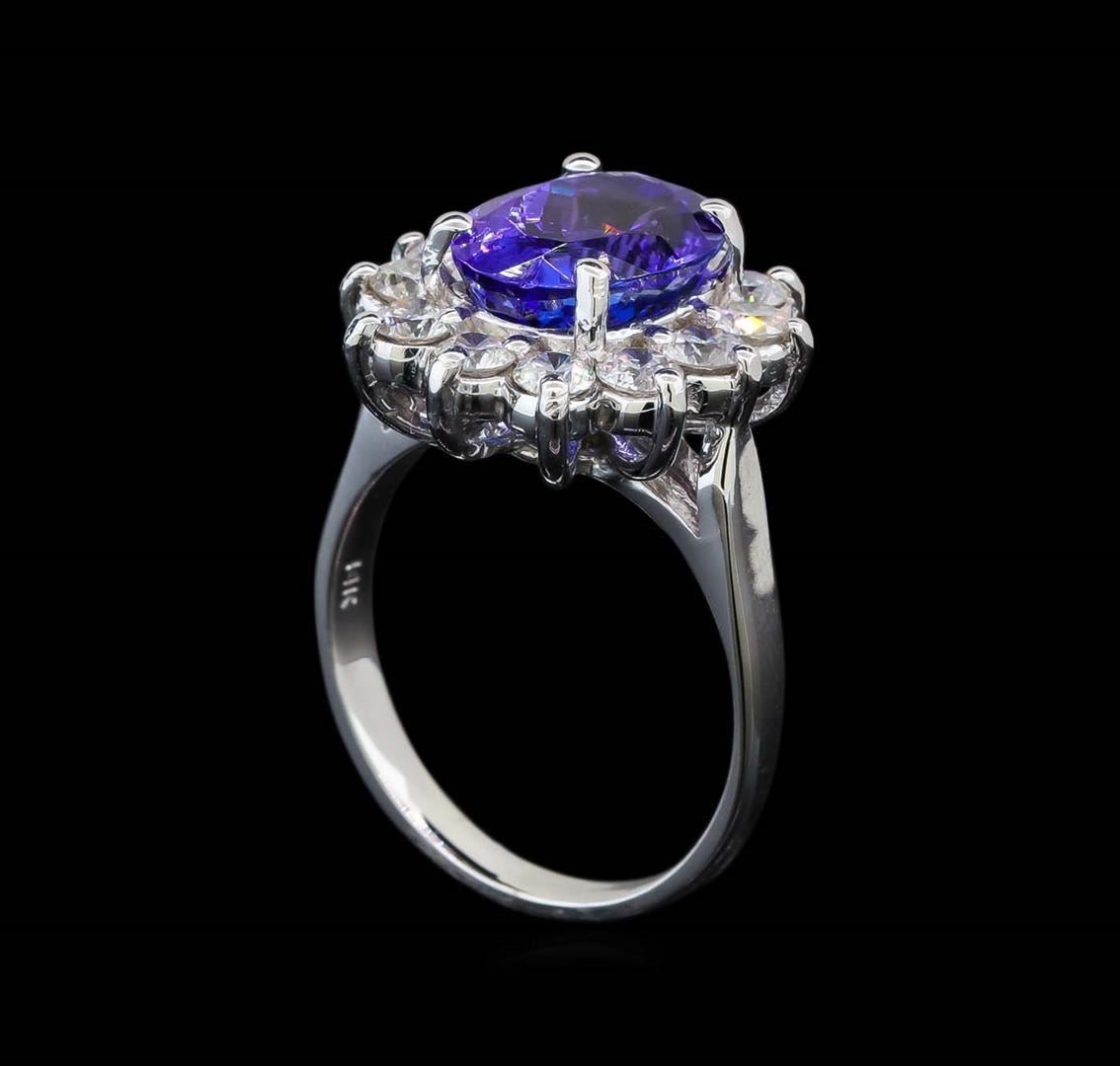 One electronically tested 14KT white gold lady's cast fashion ring with a basket halo with a bright polish finish. The featured lady's ring has a shank measuring 2.24 millimeters wide. Identified with markings of '14K'. Condition is new, good workmanship. Containing: One prong set oval modified brilliant cut natural tanzanite, measuring 10.85 x 8.26 x 5.90mm, (depth est.) approximate weight of 3.74ct., clarity is eye clean, medium dark, moderately strong, violetish blue color, (GIA vB 6/4), cut is very good. Transmitting light with no distortion, transparent. Colored gemstones are presumed to have been subjected to commonly used enhancement processes. Graded in the setting. Twelve prong set round brilliant cut diamonds, measuring 3.10 - 3.00 x 1.83mm (depth est.) approximate total weight of 12 Stones = 1.25ct. Graded in the setting. Clarity VS-2 to SI-2. Color: H - J Cut Very Good. Total Weight of Colored Stones 3.74ct.. Total Weight of Diamonds 1.25ct.. Total Weight of Ring 6.10gm. GAS Appraised at $10,555.00.