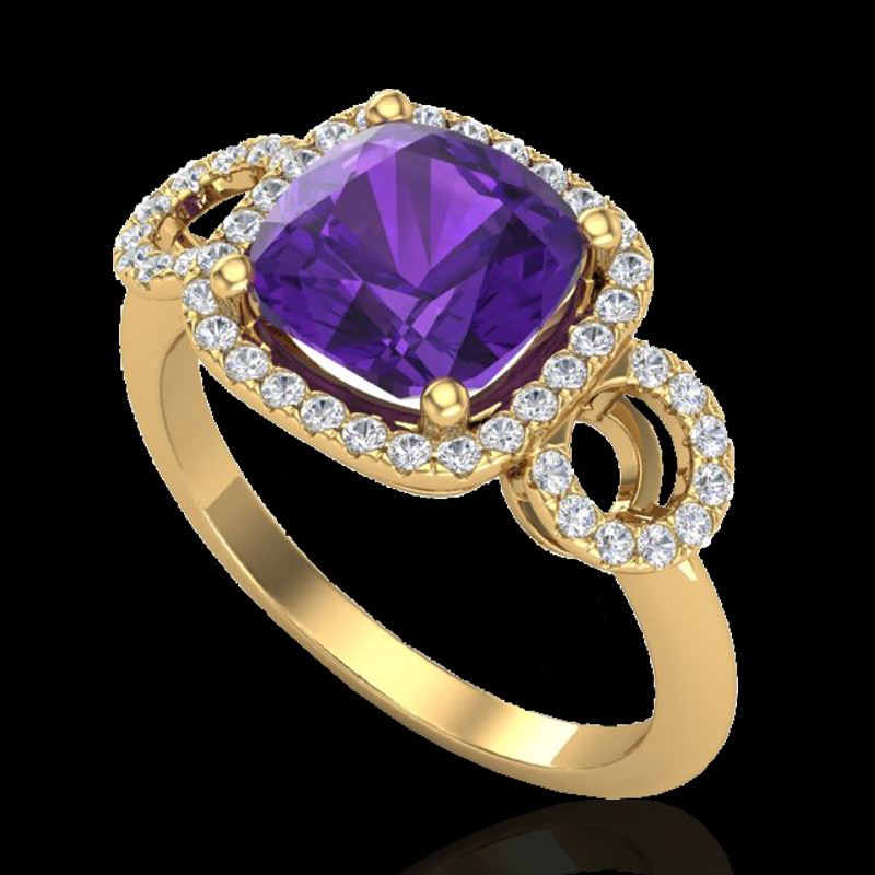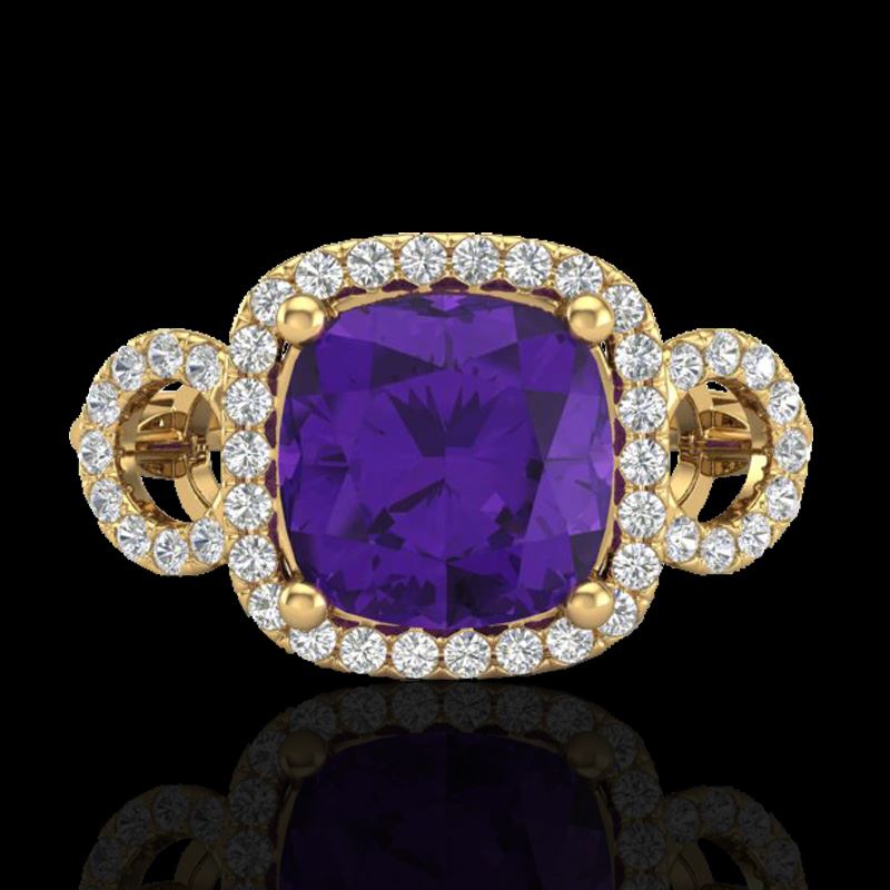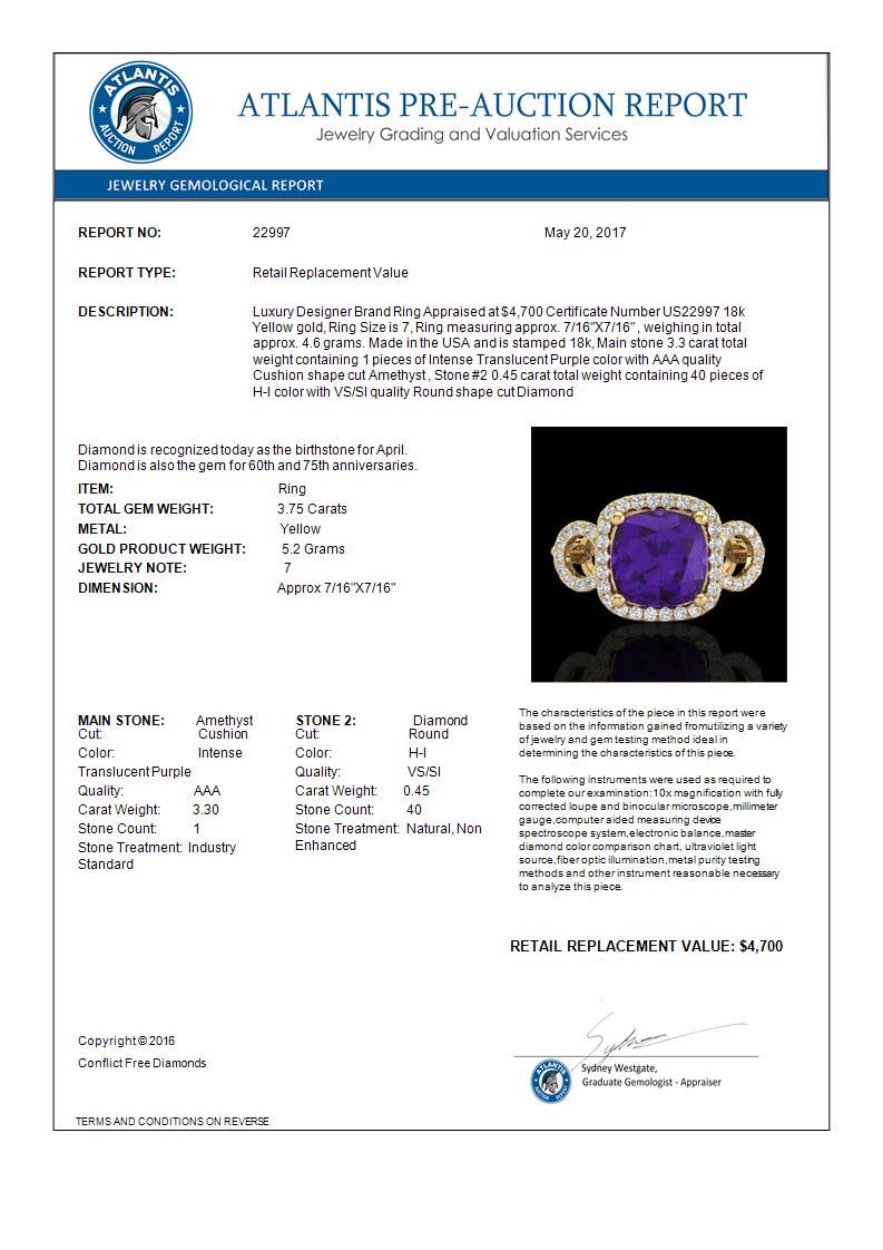 3.75 CTW Amethyst & Micro VS/SI Diamond Certified Ring 18K Yellow Gold ---- Luxury Designer Brand Ring Appraised Retail Price at $4,700 ---- SKU Number US22997 18k Yellow gold Ring Size is 7, Ring measuring approx. 7/16"X7/16" , weighing in total approx. 4.6 grams. Made in the USA and is stamped 18k, Main stone 3.30 carat total weight containing 1 pieces of Intense Translucent Purple color with AAA quality Cushion shape cut Amethyst , Stone #2 0.45 carat total weight containing 40 pieces of H-I color with VS/SI quality Round shape cut