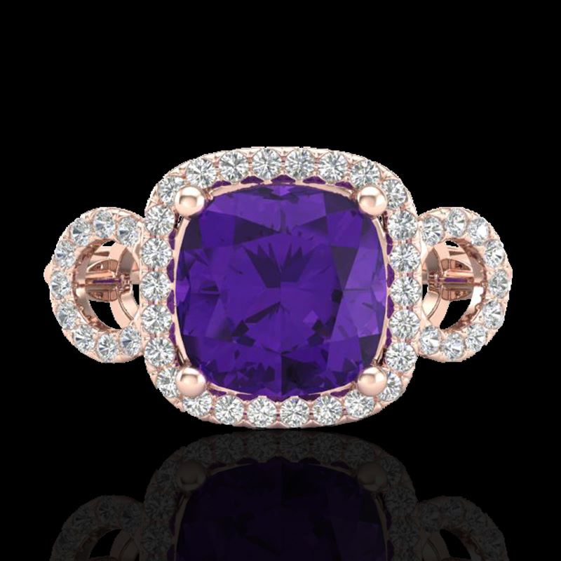 REF-54X9T -22996 ---- 3.75 CTW Amethyst & Micro VS/SI Diamond Ring 14K Rose Gold ---- Luxury Designer Brand Ring Appraised at $3,950 Certificate Number US22996 14k Rose gold, Ring Size is 7, Ring measuring approx. 7/16"X7/16" , weighing in total approx. 4 grams. Made in the USA and is stamped 14k, Main stone 3.3 carat total weight containing 1 pieces of Intense Translucent Purple color with AAA quality Cushion shape cut Amethyst , Stone #2 0.45 carat total weight containing 40 pieces of H-I color with VS/SI quality Round shape cut Diamond