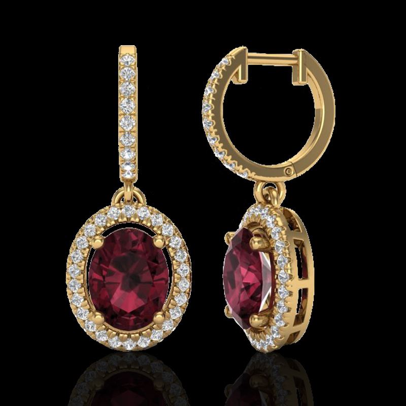 20326 - REF-100R2K ---- 3.75 CTW Garnet & Micro Pave VS/SI Diamond Earrings Solitaire Halo 18K Yellow Gold ---- Luxury Designer Brand Earring Appraised at $7,150 Certificate Number US20326 18k Yellow gold, Earring Size is 1 Inches, Earring measuring approx. 1"X 1/2" , weighing in total approx. 6 grams. Made in the USA and is stamped 18k, Main stone 3.05 carat total weight containing 2 pieces of Saturated purplish Red color with AAA quality Oval shape cut Garnet , Stone #2 0.7 carat total weight containing 74 pieces of H-I color with VS/SI quality Round shape cut Diamond