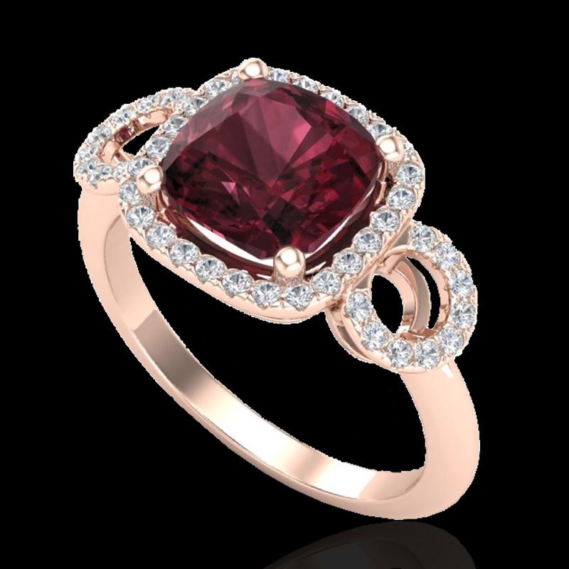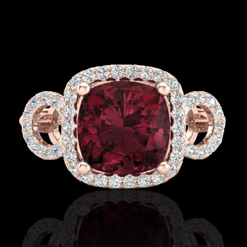 REF-54W9F -23004 ---- 3.75 CTW Garnet & Micro VS/SI Diamond Ring 14K Rose Gold ---- Luxury Designer Brand Ring Appraised at $3,600 Certificate Number US23004 14k Rose gold, Ring Size is 7, Ring measuring approx. 7/16"X7/16" , weighing in total approx. 4 grams. Made in the USA and is stamped 14k, Main stone 3.3 carat total weight containing 1 pieces of Saturated purplish Red color with AAA quality Cushion shape cut Garnet , Stone #2 0.45 carat total weight containing 40 pieces of H-I color with VS/SI quality Round shape cut Diamond