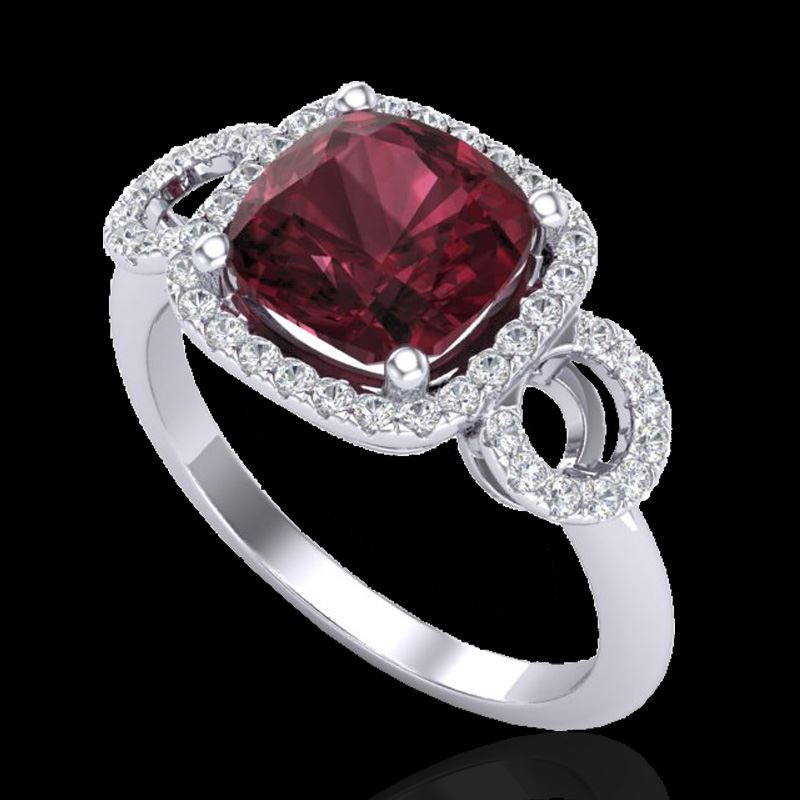 REF-65X3T -23003 ---- 3.75 CTW Garnet & Micro VS/SI Diamond Ring 18K White Gold ---- Luxury Designer Brand Ring Appraised at $4,300 Certificate Number US23003 18k White gold, Ring Size is 7, Ring measuring approx. 7/16"X7/16" , weighing in total approx. 4 grams. Made in the USA and is stamped 18k, Main stone 3.3 carat total weight containing 1 pieces of Saturated purplish Red color with AAA quality Cushion shape cut Garnet , Stone #2 0.45 carat total weight containing 40 pieces of H-I color with VS/SI quality Round shape cut Diamond