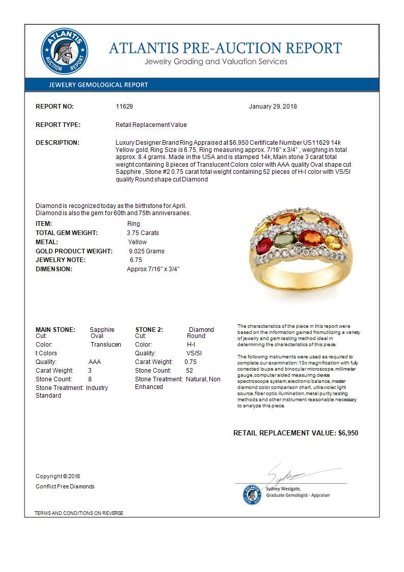REF-105T5M -11629 ---- 3.75 CTW Multi-Sapphire & Diamond Ring 14K Yellow Gold ---- Luxury Designer Brand Ring Appraised at $6,950 Certificate Number US11629 14k Yellow gold, Ring Size is 6.75, Ring measuring approx. 7/16" x 3/4" , weighing in total approx. 8.4 grams. Made in the USA and is stamped 14k, Main stone 3 carat total weight containing 8 pieces of Translucent Colors color with AAA quality Oval shape cut Sapphire , Stone #2 0.75 carat total weight containing 52 pieces of H-I color with VS/SI quality Round shape cut Diamond
