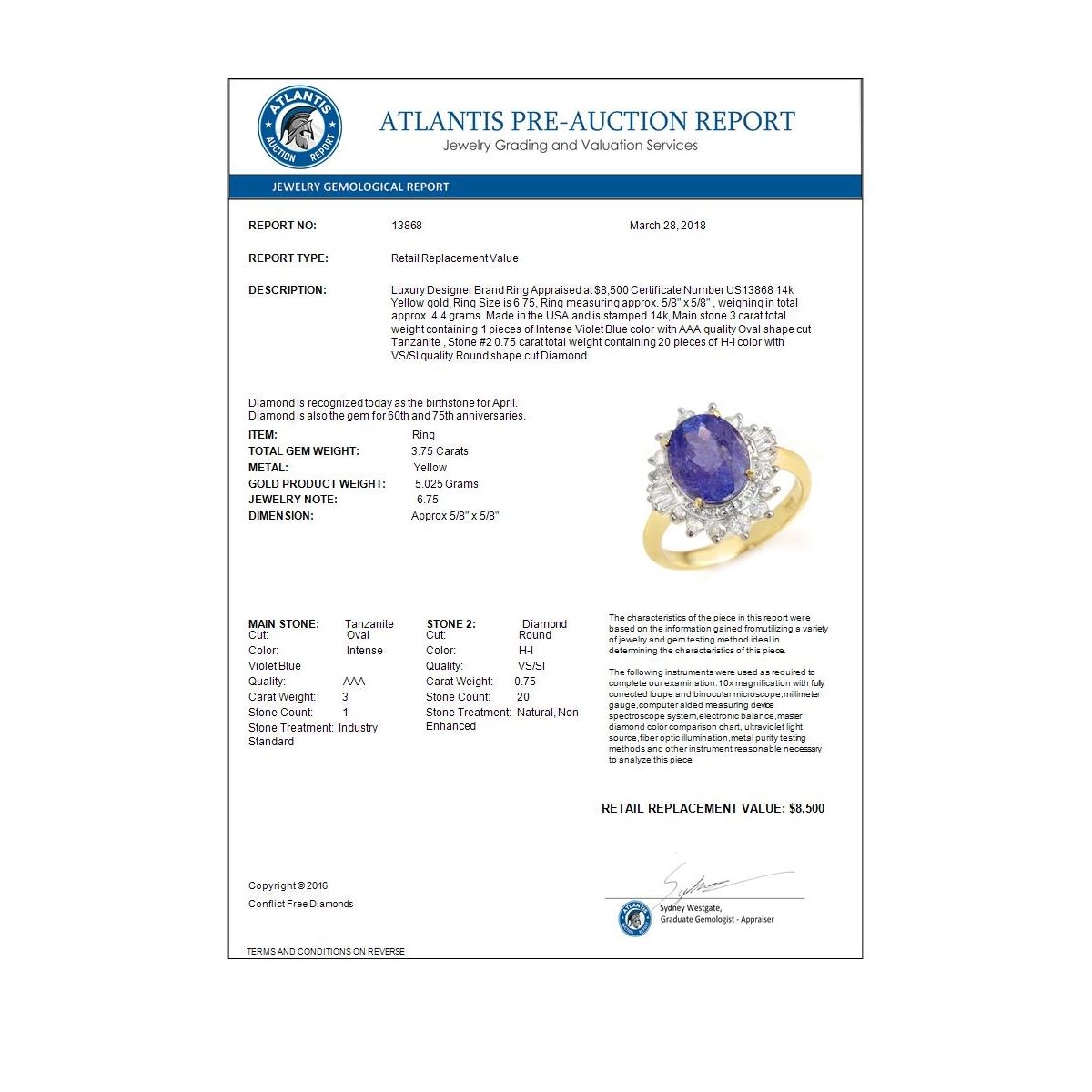 REF-110X4T -13868 ---- 3.75 CTW Tanzanite & Diamond Ring 14K Yellow Gold ---- Luxury Designer Brand Ring Appraised at $8,500 Certificate Number US13868 14k Yellow gold, Ring Size is 6.75, Ring measuring approx. 5/8" x 5/8" , weighing in total approx. 4.4 grams. Made in the USA and is stamped 14k, Main stone 3 carat total weight containing 1 pieces of Intense Violet Blue color with AAA quality Oval shape cut Tanzanite , Stone #2 0.75 carat total weight containing 20 pieces of H-I color with VS/SI quality Round shape cut Diamond
