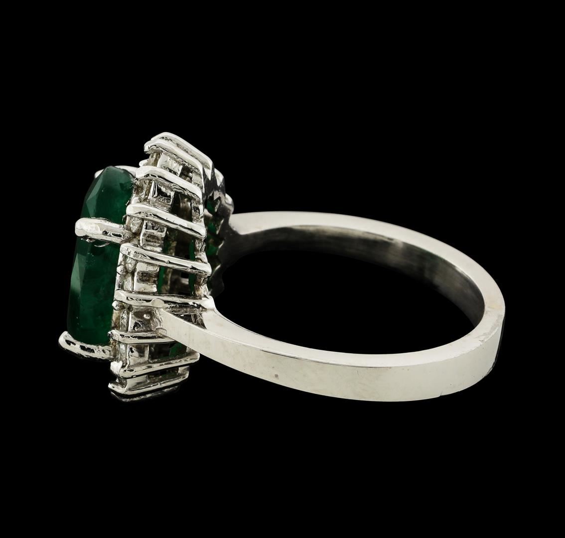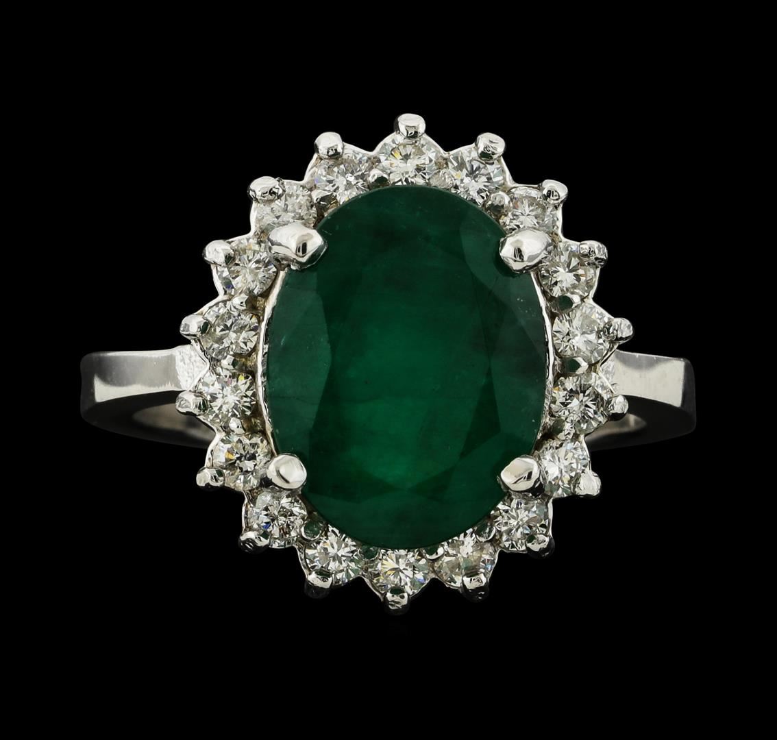 One electronically tested 14KT white gold lady's cast fashion ring with a basket halo with a bright polish finish. The featured lady's ring has a shank measuring 2.60 millimeters wide. Identified with markings of '14K'. Condition is new, good workmanship. Containing: One prong set oval modified mixed cut natural emerald, measuring 11.80 x 9.05 x 5.10mm, (depth est.) 15%. bulge factor, approximate weight of 3.75ct., clarity is heavily included, medium dark, moderately strong, green color, (GIA G 6/4), cut is good. Transmitting light somewhat diffusely, semi-transparent to translucent. Indications of oil residue. Naturally occurring internal & external characteristics are present. Colored gemstones are presumed to have been subjected to commonly used enhancement processes. Graded in the setting. Eighteen prong set round brilliant cut diamonds, measuring 2.10 - 2.00 x 1.23mm (depth est.) approximate total weight of 18 Stones = 0.56ct. Graded in the setting. Clarity SI-1 to SI-3. Color: G - H Cut Good. Total Weight of Colored Stones 3.75ct.. Total Weight of Diamonds 0.56ct.. Total Weight of Ring 6.00gm. GAS Appraised at $4,955.00.