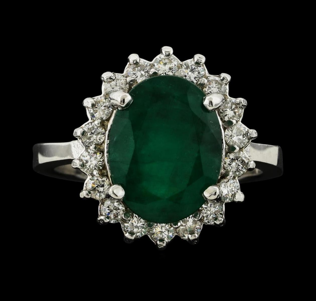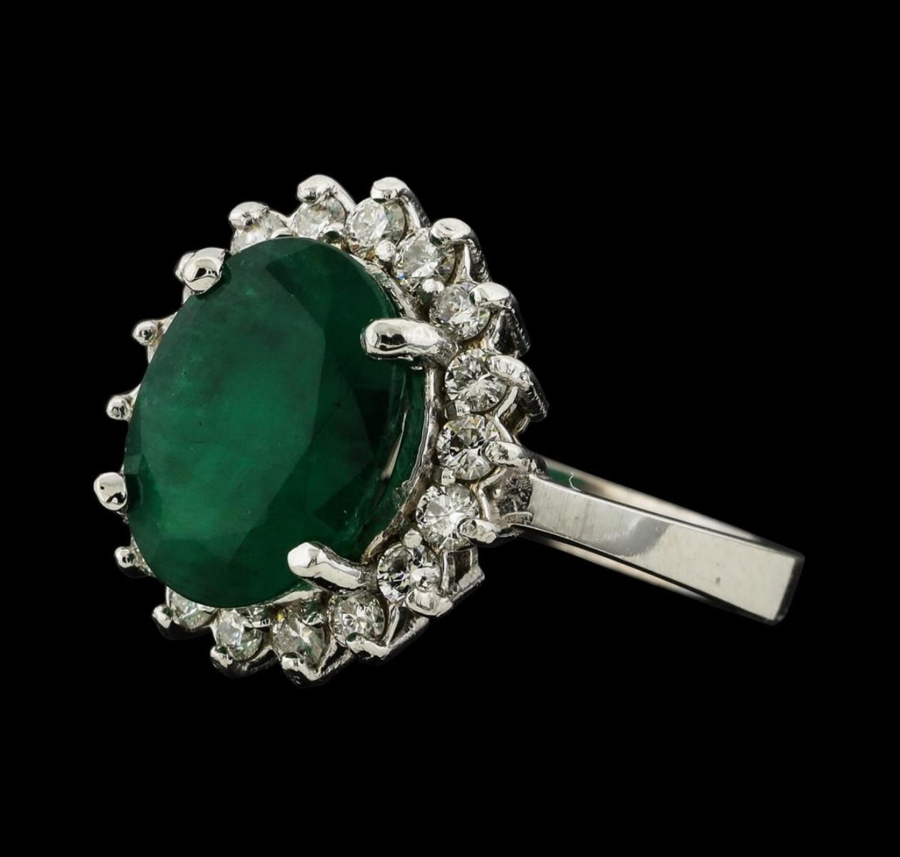 One electronically tested 14KT white gold lady's cast fashion ring with a basket halo with a bright polish finish. The featured lady's ring has a shank measuring 2.60 millimeters wide. Identified with markings of '14K'. Condition is new, good workmanship. Containing: One prong set oval modified mixed cut natural emerald, measuring 11.80 x 9.05 x 5.10mm, (depth est.) 15%. bulge factor, approximate weight of 3.75ct., clarity is heavily included, medium dark, moderately strong, green color, (GIA G 6/4), cut is good. Transmitting light somewhat diffusely, semi-transparent to translucent. Indications of oil residue. Naturally occurring internal & external characteristics are present. Colored gemstones are presumed to have been subjected to commonly used enhancement processes. Graded in the setting. Eighteen prong set round brilliant cut diamonds, measuring 2.10 - 2.00 x 1.23mm (depth est.) approximate total weight of 18 Stones = 0.56ct. Graded in the setting. Clarity SI-1 to SI-3. Color: G - H Cut Good. Total Weight of Colored Stones 3.75ct.. Total Weight of Diamonds 0.56ct.. Total Weight of Ring 6.00gm. GAS Appraised.