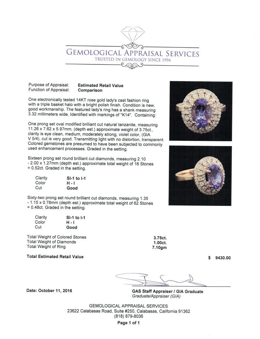 One electronically tested 14KT rose gold lady's cast fashion ring with a triple basket halo with a bright polish finish. The featured lady's ring has a shank measuring 3.32 millimeters wide. Identified with markings of 'K14'. Condition is new, good workmanship. Containing: One prong set oval modified brilliant cut natural tanzanite, measuring 11.26 x 7.62 x 5.97mm, (depth est.) approximate weight of 3.75ct., clarity is eye clean, medium, moderately strong, violet color, (GIA V 5/4), cut is very good. Transmitting light with no distortion, transparent. Colored gemstones are presumed to have been subjected to commonly used enhancement processes. Graded in the setting. Sixteen prong set round brilliant cut diamonds, measuring 2.10 - 2.00 x 1.27mm (depth est.) approximate total weight of 16 Stones = 0.52ct. Graded in the setting. Clarity SI-1 to I-1. Color: H - I Cut Good Sixty-Two prong set round brilliant cut diamonds, measuring 1.35 - 1.15 x 0.78mm (depth est.) approximate total weight of 62 Stones = 0.48ct. Graded in the setting. Clarity SI-1 to I-1. Color: H - I Cut Good. Total Weight of Colored Stones 3.75ct.. Total Weight of Diamonds 1.00ct.. Total Weight of Ring 7.10gm. GAS Appraised at $9,430.00.