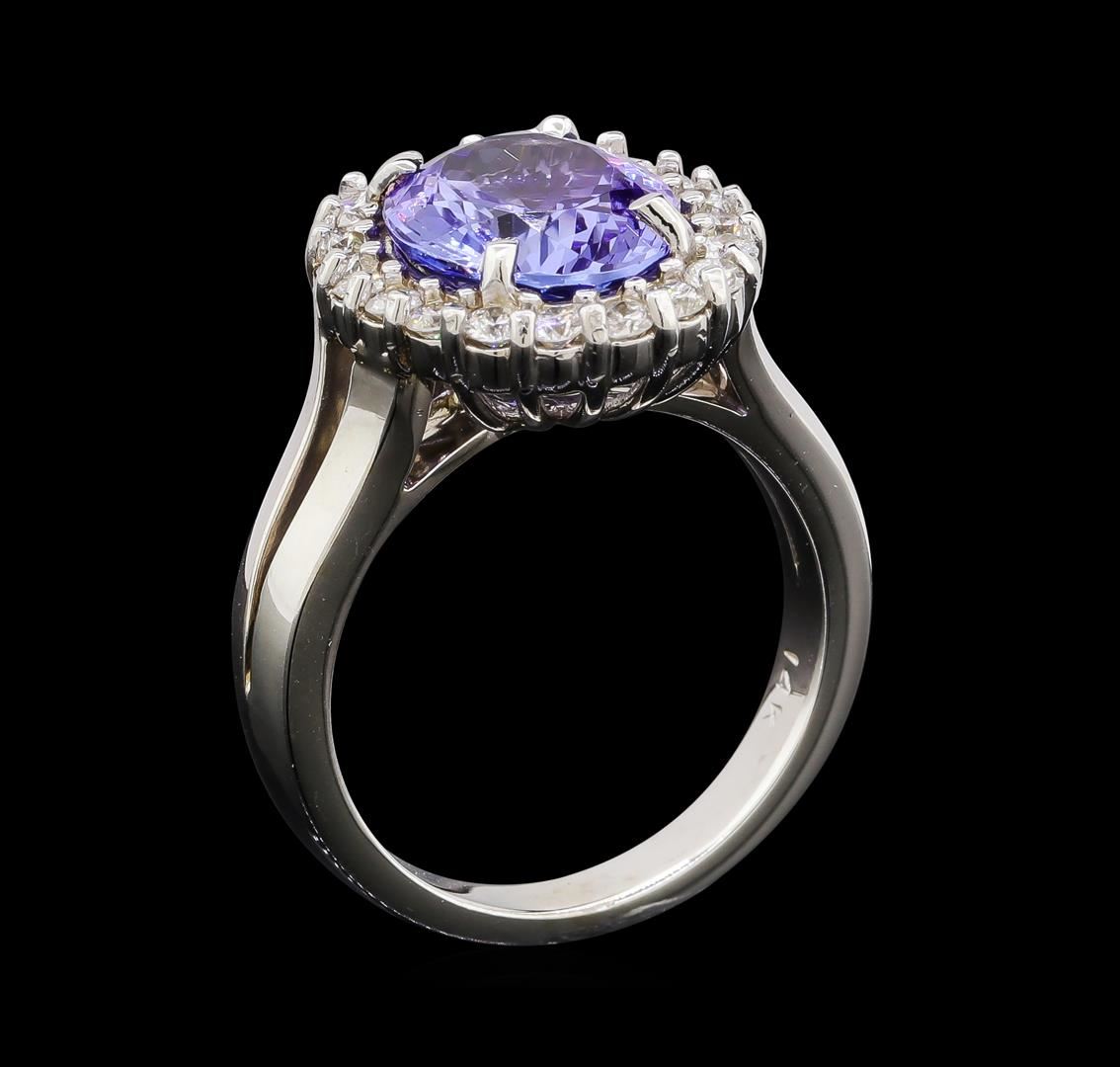 One electronically tested 14KT white gold lady's cast fashion ring with a split shank basket halo with a bright polish finish. The featured lady's ring has a shank measuring 3.11 millimeters wide. Identified with markings of '14K'. Condition is new, good workmanship. Containing: One prong set oval modified brilliant cut natural tanzanite, measuring 11.00 x 9.05 x 5.20mm, (depth est.) approximate weight of 3.75ct., clarity is eye clean, medium, moderately strong, bluish violet color, (GIA bV 5/4), cut is very good. Transmitting light with no distortion, transparent. Colored gemstones are presumed to have been subjected to commonly used enhancement processes. Graded in the setting. Twenty prong set round brilliant cut diamonds, measuring 2.10 - 2.00 x 1.23mm (depth est.) approximate total weight of 20 Stones = 0.62ct. Graded in the setting. Clarity SI-1 to SI-2. Color: H - I Cut Good. Total Weight of Colored Stones 3.75ct.. Total Weight of Diamonds 0.62ct.. Total Weight of Ring 9.10gm. GAS Appraised at $8,685.00.