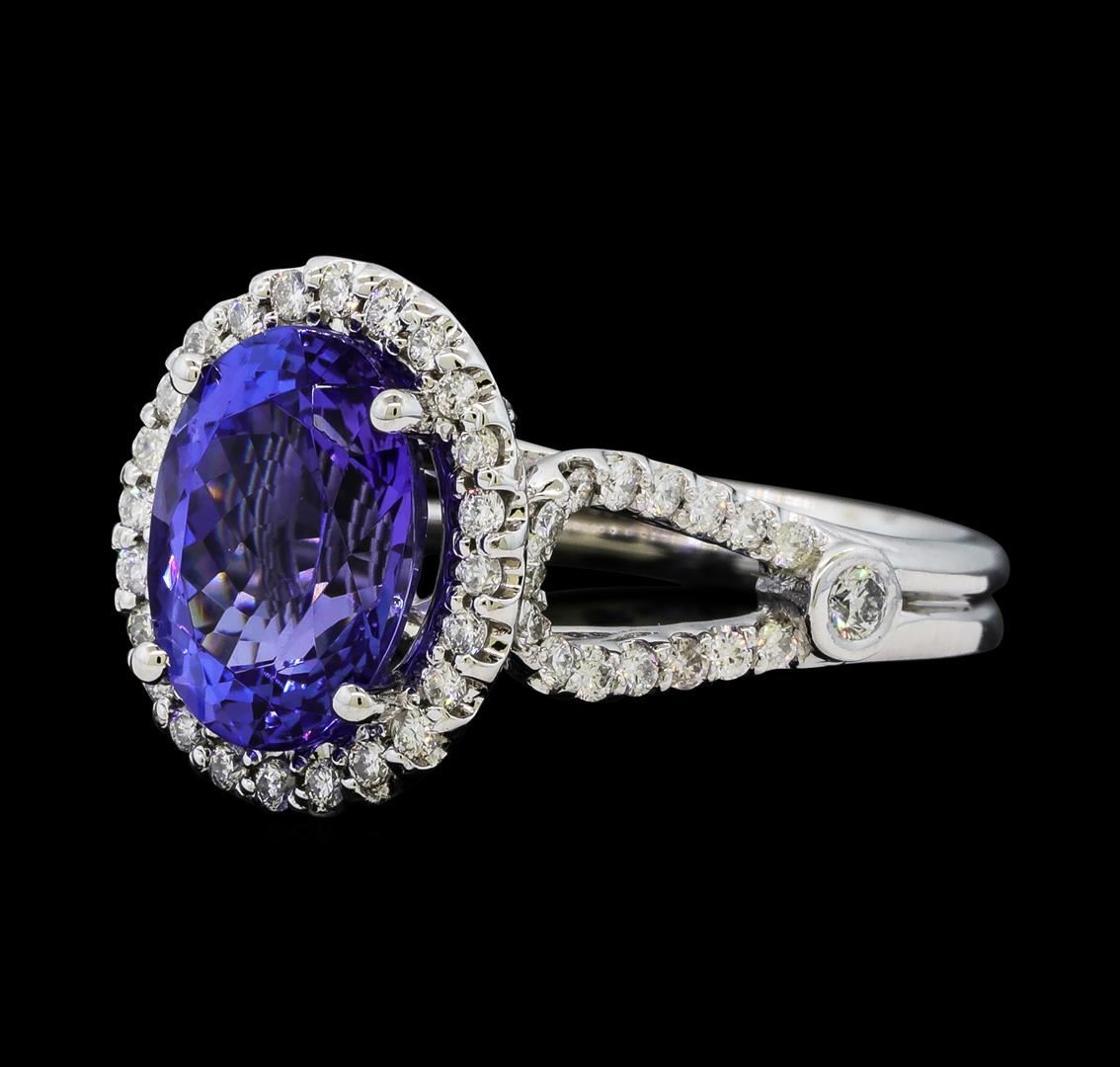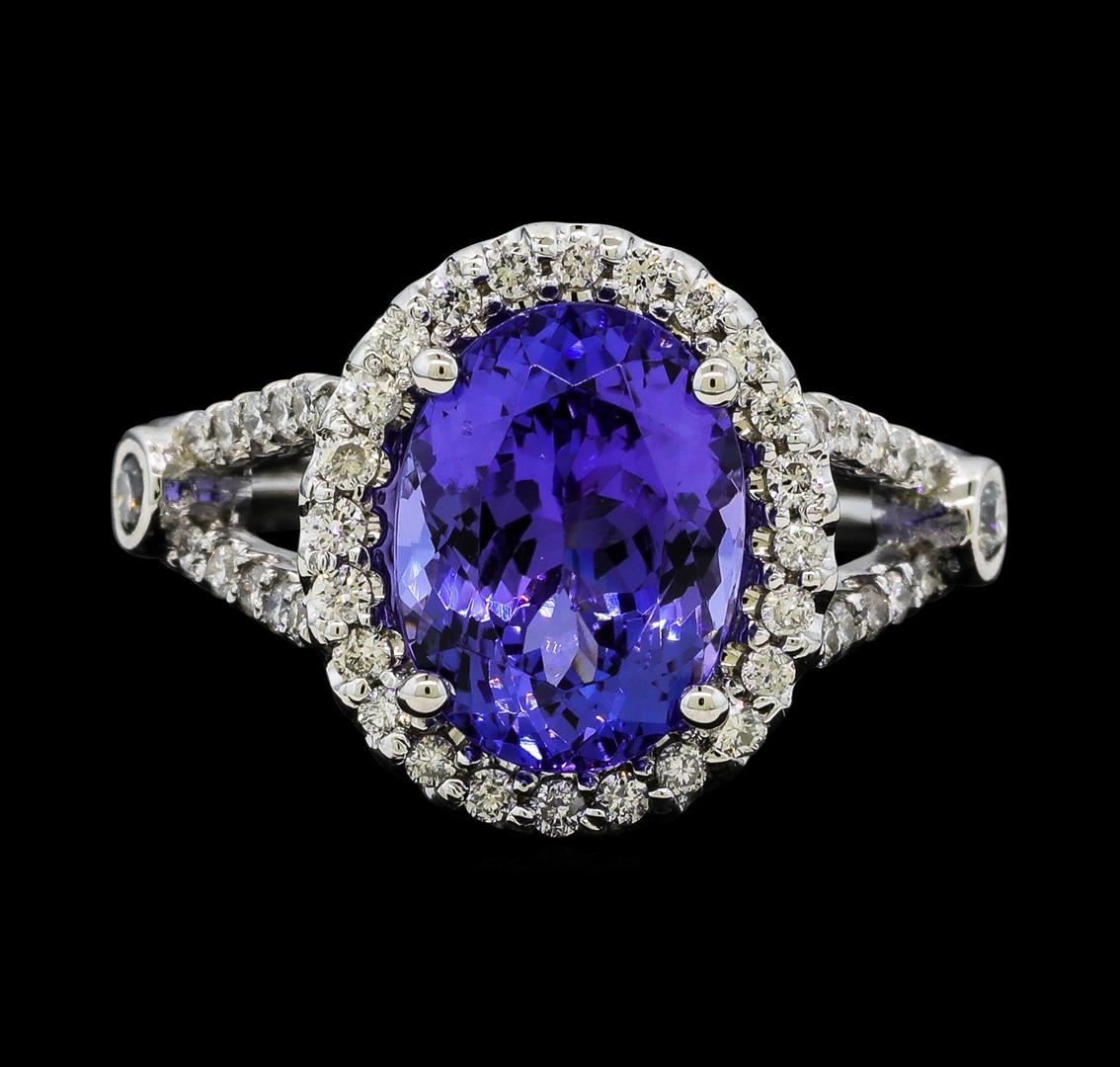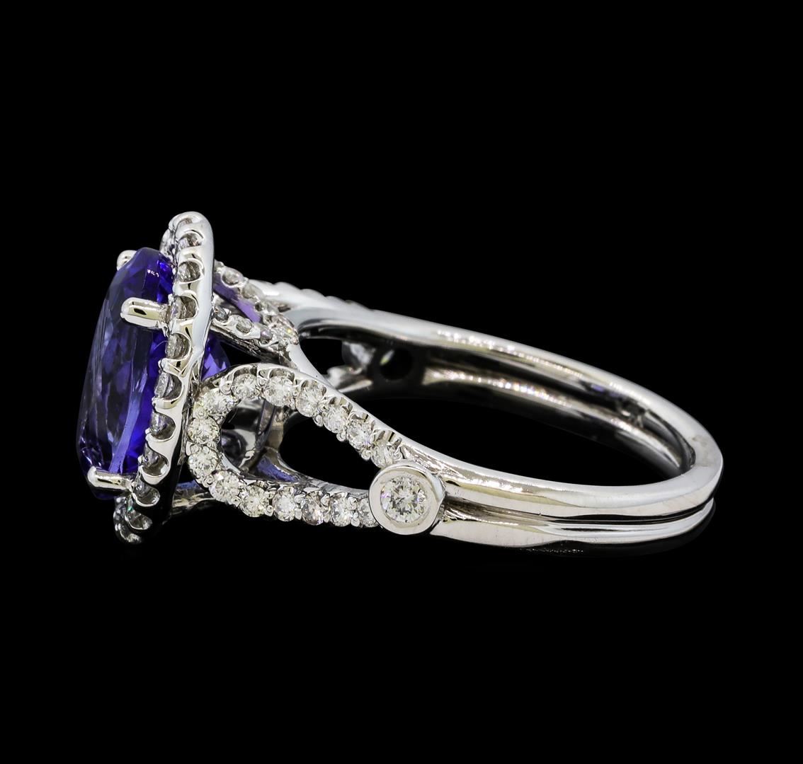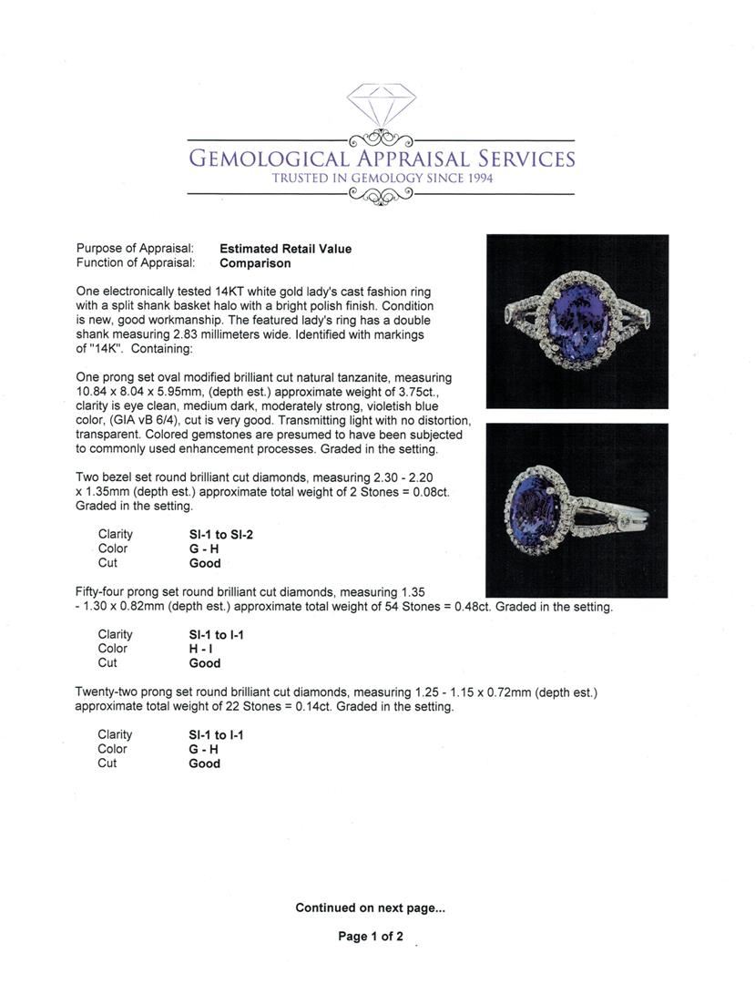 One electronically tested 14KT white gold lady's cast fashion ring with a split shank basket halo with a bright polish finish. The featured lady's ring has a double shank measuring 2.83 millimeters wide. Identified with markings of '14K'. Condition is new, good workmanship. Containing: One prong set oval modified brilliant cut natural tanzanite, measuring 10.84 x 8.04 x 5.95mm, (depth est.) approximate weight of 3.75ct., clarity is eye clean, medium dark, moderately strong, violetish blue color, (GIA vB 6/4), cut is very good. Transmitting light with no distortion, transparent. Colored gemstones are presumed to have been subjected to commonly used enhancement processes. Graded in the setting. Two bezel set round brilliant cut diamonds, measuring 2.30 - 2.20 x 1.35mm (depth est.) approximate total weight of 2 Stones = 0.08ct. Graded in the setting. Clarity SI-1 to SI-2. Color: G - H Cut Good Fifty-Four prong set round brilliant cut diamonds, measuring 1.35 - 1.30 x 0.82mm (depth est.) approximate total weight of 54 Stones = 0.48ct. Graded in the setting. Clarity SI-1 to I-1. Color: H - I Cut Good Twenty-Two prong set round brilliant cut diamonds, measuring 1.25 - 1.15 x 0.72mm (depth est.) approximate total weight of 22 Stones = 0.14ct. Graded in the setting. Clarity SI-1 to I-1. Color: G - H Cut Good. Total Weight of Colored Stones 3.75ct.. Total Weight of Diamonds 0.70ct.. Total Weight of Ring 5.30gm. GAS Appraised at $9,460.00.
