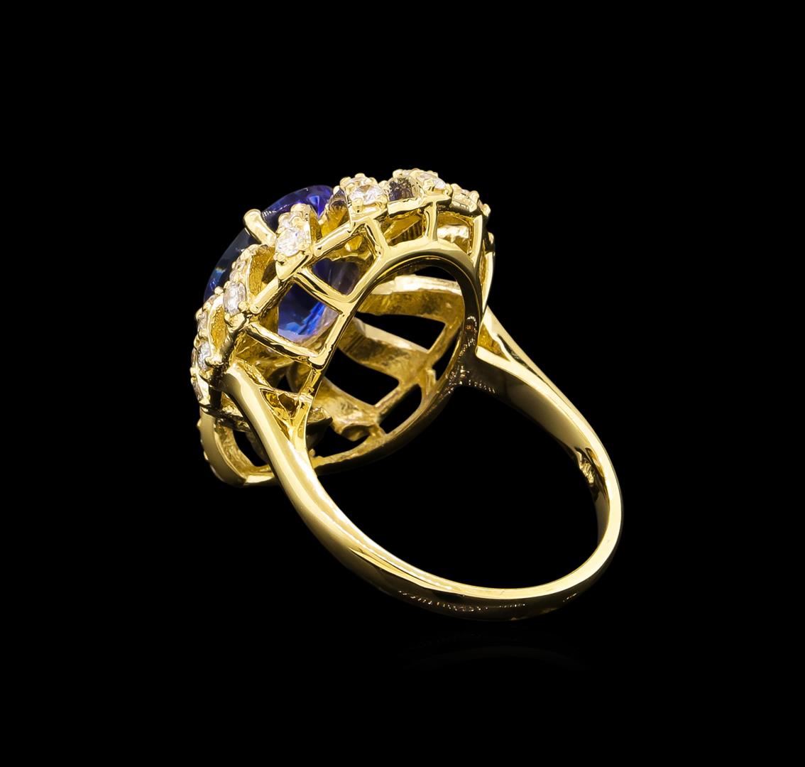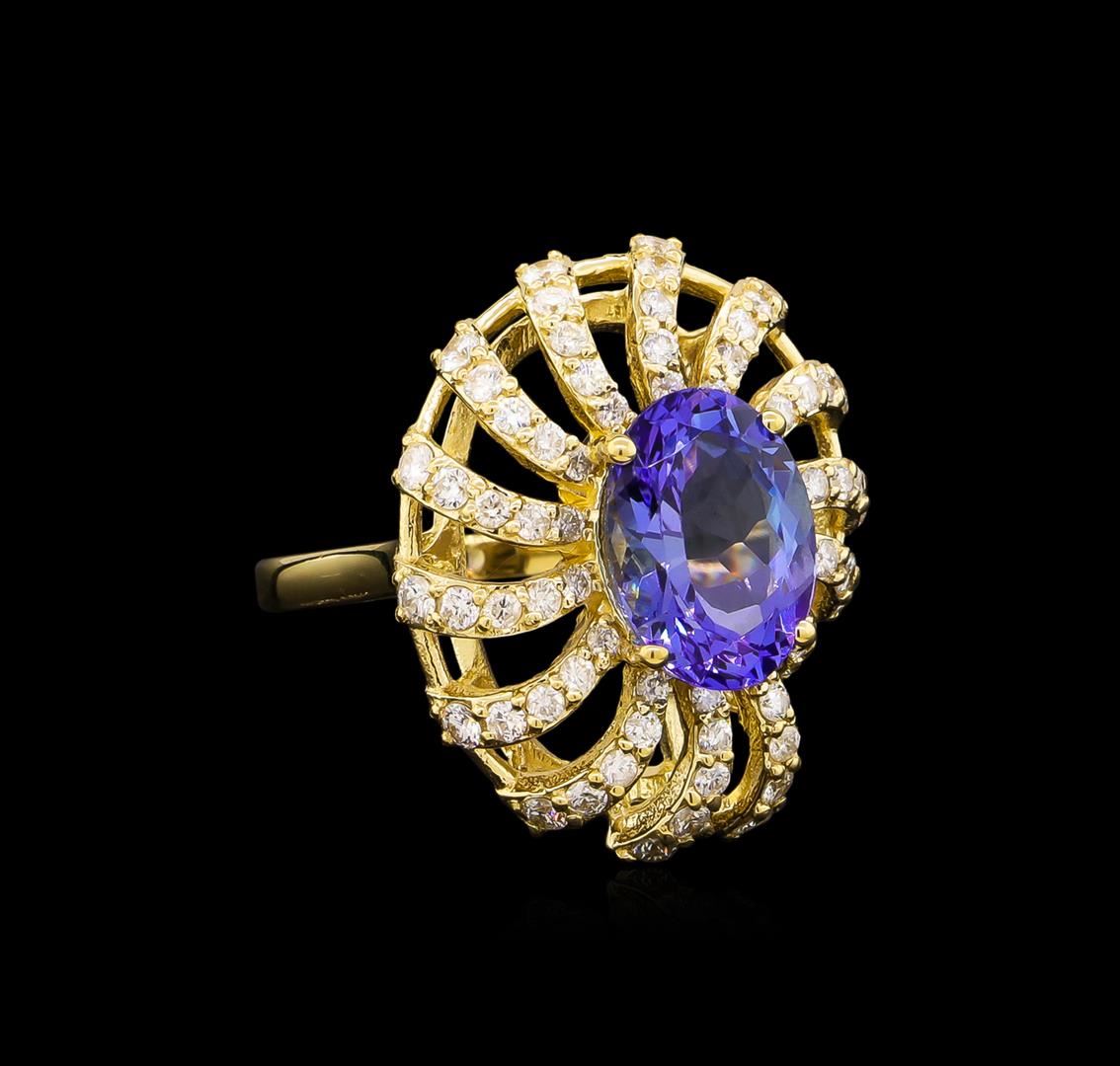 One electronically tested 14KT yellow gold lady's cast fashion ring with a spiral halo with a bright polish finish. The featured lady's ring has a shank measuring 1.93 millimeters wide. Identified with markings of "K14". Condition is new, good workmanship. Containing: One prong set oval modified brilliant cut natural tanzanite, measuring 11.34 x 8.58 x 5.50mm, approximate weight of 3.76ct., clarity is eye clean, type I, medium dark, moderately strong, bluish violet color, (GIA bV 6/4), cut is very good. Transmitting light with no distortion, transparent. Colored gemstones are presumed to have been subjected to commonly used enhancement processes. Graded in the setting. Twenty-Five prong set round brilliant cut diamonds, measuring 1.90 - 1.60 x 1.05mm (depth est.) approximate total weight of 25 Stones = 0.49ct. Graded in the setting. Clarity: SI-1 to I-1. Color: H - I. Cut Good Forty-Two prong set round brilliant cut diamonds, measuring 1.50 - 1.35 x 0.89mm (depth est.) approximate total weight of 42 Stones = 0.46ct. Graded in the setting. Clarity: SI-1 to I-1. Color: H - I. Cut Good. Total Weight of Colored Stones 3.76ct. Total Weight of Diamonds 0.95ct. Total Weight of Ring 7.50gm. GAS Appraised at $9,935.00.