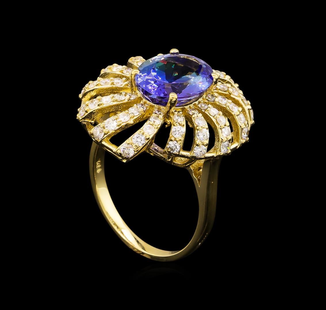 One electronically tested 14KT yellow gold lady's cast fashion ring with a spiral halo with a bright polish finish. The featured lady's ring has a shank measuring 1.93 millimeters wide. Identified with markings of "K14". Condition is new, good workmanship. Containing: One prong set oval modified brilliant cut natural tanzanite, measuring 11.34 x 8.58 x 5.50mm, approximate weight of 3.76ct., clarity is eye clean, type I, medium dark, moderately strong, bluish violet color, (GIA bV 6/4), cut is very good. Transmitting light with no distortion, transparent. Colored gemstones are presumed to have been subjected to commonly used enhancement processes. Graded in the setting. Twenty-Five prong set round brilliant cut diamonds, measuring 1.90 - 1.60 x 1.05mm (depth est.) approximate total weight of 25 Stones = 0.49ct. Graded in the setting. Clarity: SI-1 to I-1. Color: H - I. Cut Good Forty-Two prong set round brilliant cut diamonds, measuring 1.50 - 1.35 x 0.89mm (depth est.) approximate total weight of 42 Stones = 0.46ct. Graded in the setting. Clarity: SI-1 to I-1. Color: H - I. Cut Good. Total Weight of Colored Stones 3.76ct. Total Weight of Diamonds 0.95ct. Total Weight of Ring 7.50gm. GAS Appraised at $9,935.00.