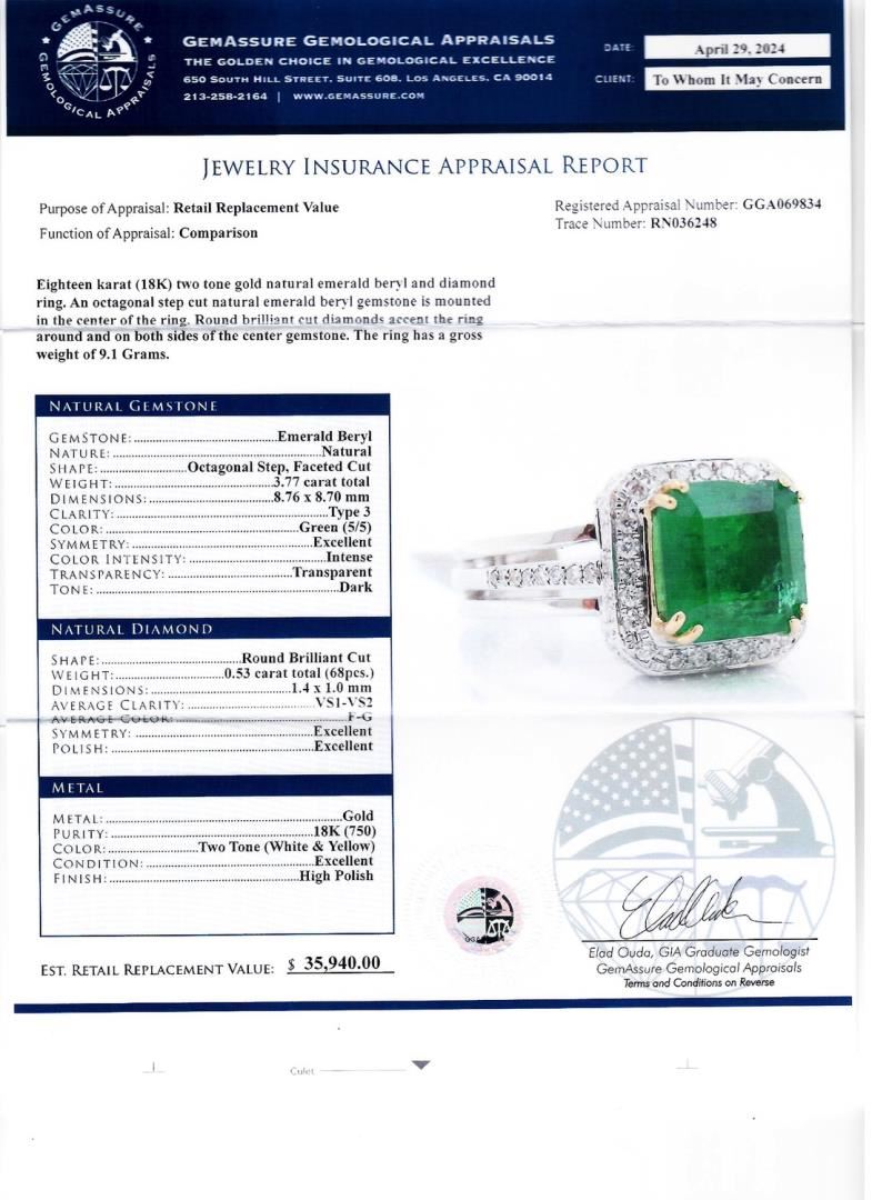 Eighteen karat (18K) two tone gold natural emerald beryl and diamond ring. An octagonal step cut natural emerald beryl gemstone is mounted in the center of the ring. Round brilliant cut diamonds accent the ring around and on both sides of the center gemstone. The ring has a gross weight of 9.1 Grams. #NATURAL GEMSTONE# GEMSTONE: Emerald Beryl NATURE: Natural SHAPE: Octagonal Step, Faceted Cut WEIGHT: 3.77 carat total DIMENSIONS: 8.76 x 8.70mm CLARITY: Type 3 COLOR: Green SYMMETRY: Excellent COLOR INTENSITY: Intense TRANSPARENCY: Transparent TONE: Dark #NATURAL DIAMOND# SHAPE: Round Brilliant Cut WEIGHT: 0.53 carat total (68pcs.) DIMENSIONS: 1.4 x 1.0mm AVERAGE CLARITY: VS1-VS2 AVERAGE COLOR: F-G SYMMETRY: Excellent POLISH: Excellent #METAL# METAL: Gold PURITY: 18K (750) COLOR: Two Tone (White & Yellow) CONDITION: Excellent FINISH: High Polish Size: 6 1/4