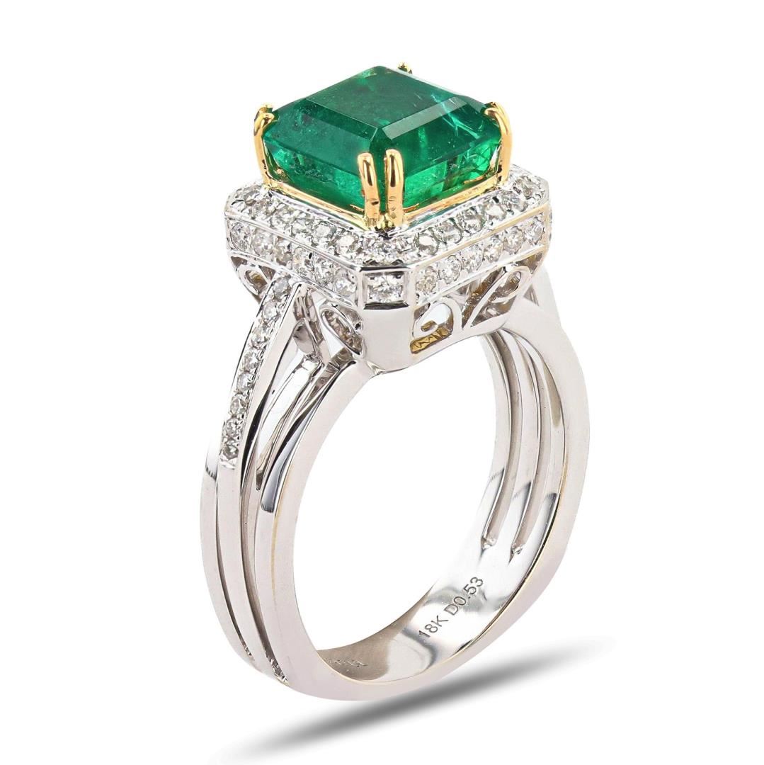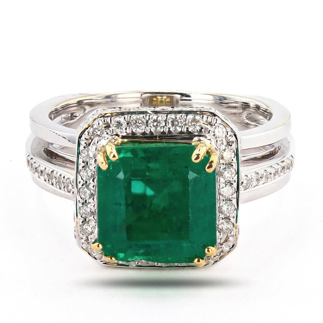 Eighteen karat (18K) two tone gold natural emerald beryl and diamond ring. An octagonal step cut natural emerald beryl gemstone is mounted in the center of the ring. Round brilliant cut diamonds accent the ring around and on both sides of the center gemstone. The ring has a gross weight of 9.1 Grams. #NATURAL GEMSTONE# GEMSTONE: Emerald Beryl NATURE: Natural SHAPE: Octagonal Step, Faceted Cut WEIGHT: 3.77 carat total DIMENSIONS: 8.76 x 8.70mm CLARITY: Type 3 COLOR: Green SYMMETRY: Excellent COLOR INTENSITY: Intense TRANSPARENCY: Transparent TONE: Dark #NATURAL DIAMOND# SHAPE: Round Brilliant Cut WEIGHT: 0.53 carat total (68pcs.) DIMENSIONS: 1.4 x 1.0mm AVERAGE CLARITY: VS1-VS2 AVERAGE COLOR: F-G SYMMETRY: Excellent POLISH: Excellent #METAL# METAL: Gold PURITY: 18K (750) COLOR: Two Tone (White & Yellow) CONDITION: Excellent FINISH: High Polish Size: 6 1/4