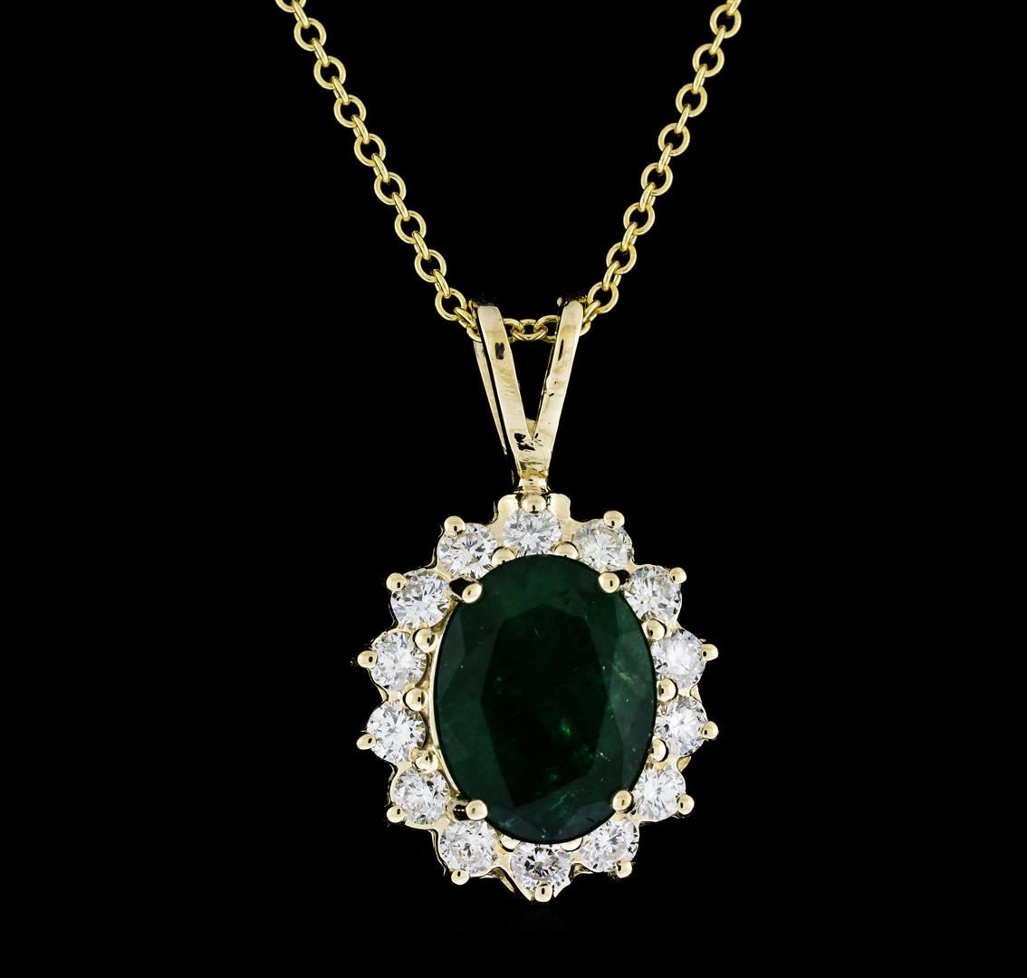 One electronically tested 14KT yellow gold lady's cast fashion pendant & chain 18.0' long, 1.2mm oval cable link with a lobster claw clasp with a basket halo with a bright polish finish. Identified with markings of '14K'. Condition is new, good workmanship. Containing: One prong set oval modified mixed cut natural emerald, measuring 11.11 x 8.60 x 6.11mm, (depth est.) 12%. bulge factor, approximate weight of 3.77ct., clarity is heavily included, medium dark, moderately strong, green color, (GIA G 6/4), cut is good. Transmitting light somewhat diffusely, semi-transparent to translucent. Naturally occurring internal & external characteristics are present. Indications of oil residue. Colored gemstones are presumed to have been subjected to commonly used enhancement processes. Graded in the setting. Fourteen prong set round brilliant cut diamonds, measuring 2.40 - 2.30 x 1.46mm (depth est.) approximate total weight of 14 Stones = 0.70ct. Graded in the setting. Clarity SI-1 to SI-3. Color: H - I Cut Good. Total Weight of Colored Stones 3.77ct.. Total Weight of Diamonds 0.70ct.. Total Weight of Pendant & Chain 5.00gm. GAS Appraised at $5,910.00.