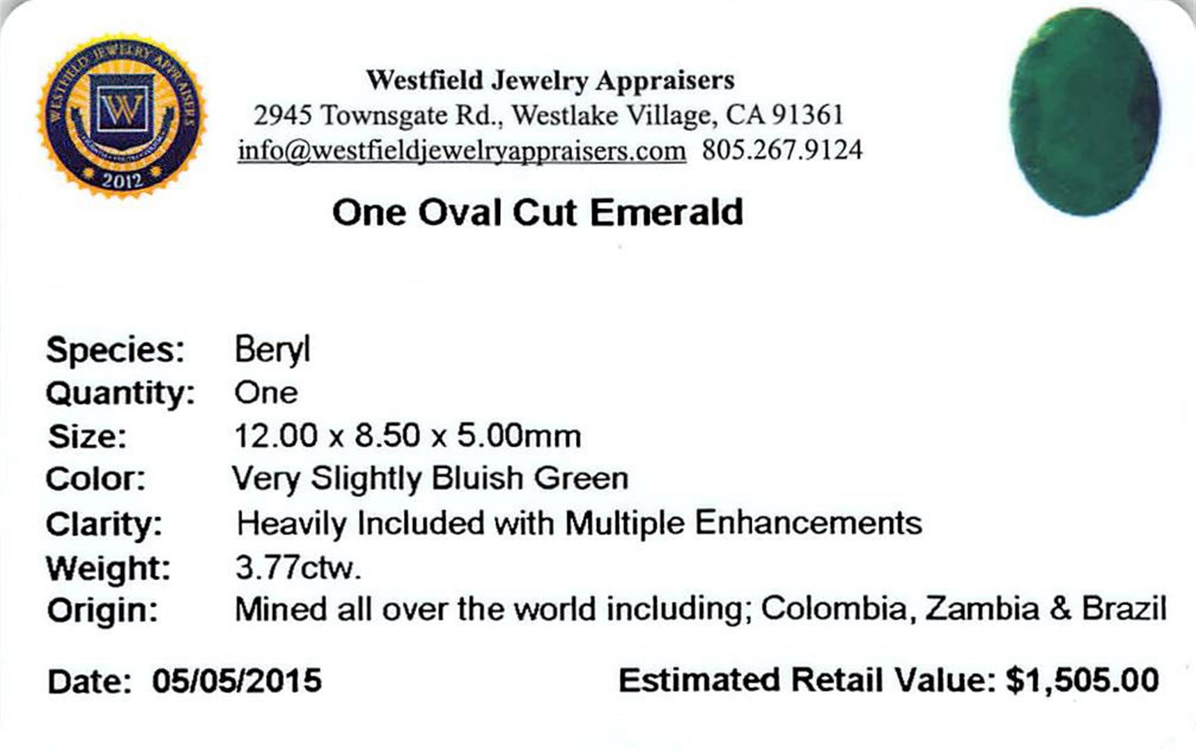 One oval mixed cut natural emerald, measuring 12.00 x 8.50 x 5.00mm, exact weight 3.77ct., clarity is heavily included, type III, medium dark, very slightly grayish, very slightly bluish green color, (GIA vslbG 6/3) Indications of multiple laboratory enhancements, including high temperature heat treatment. Westfield Appraised at $1,505.00.