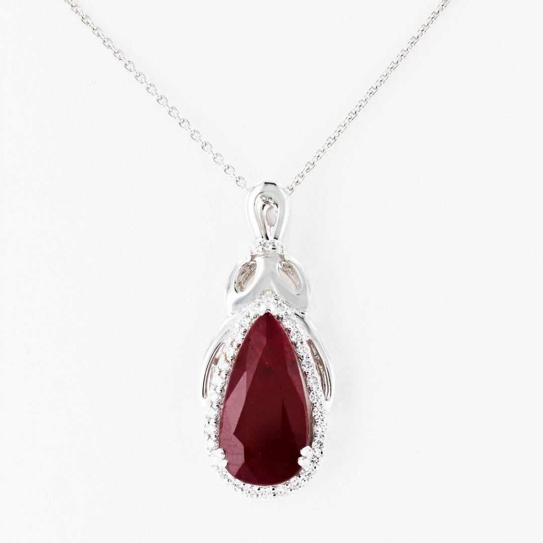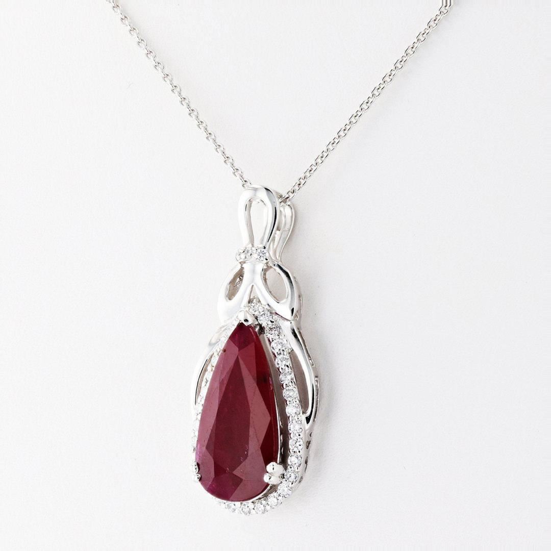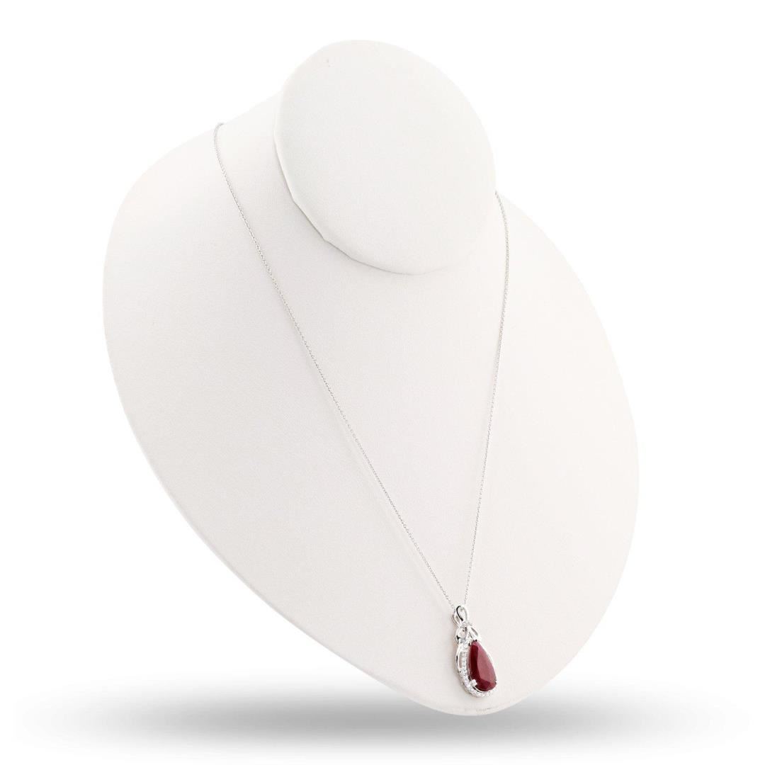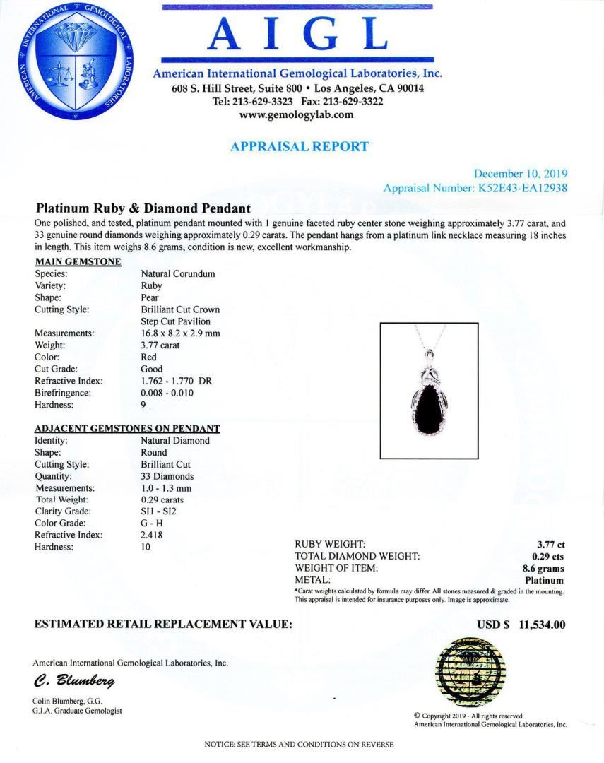 One polished, and tested, platinum pendant mounted with 1 genuine faceted ruby center stone weighing approximately 3.77 carat, and 33 genuine round diamonds weighing approximately 0.29 carats. The pendant hangs from a platinum link necklace measuring 18 inches in length. This item weighs 8.6 grams, condition is new, excellent workmanship. MAIN GEMSTONE Species: Natural Corundum Variety: Ruby Shape: Pear Cutting Style: Brilliant Cut Crown Step Cut Pavilion Measurements: 16.8mm x 8.2mm x 2.9mm Weight: 3.77 carat Color: Red Cut Grade: Good Refractive Index: 1.762 - 1.770 DR Birefringence: 0.008 - 0.010 Hardness: 9 ADJACENT GEMSTONES ON PENDANT Identity: Natural Diamond Shape: Round Cutting Style: Brilliant Cut Quantity: 33 Diamonds Measurements: 1.0mm to 1.3mm Total Weight: 0.29 carats Clarity Grade: SI1 to SI2 Color Grade: G - H Refractive Index: 2.418 Hardness: 10 RUBY WEIGHT: 3.77 ct TOTAL DIAMOND WEIGHT: 0.29 cts WEIGHT OF ITEM: 8.6 grams METAL: Platinum