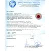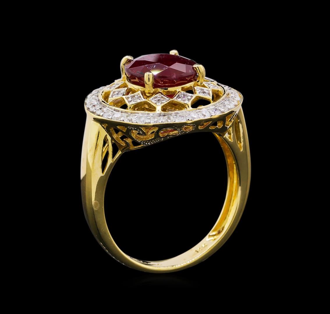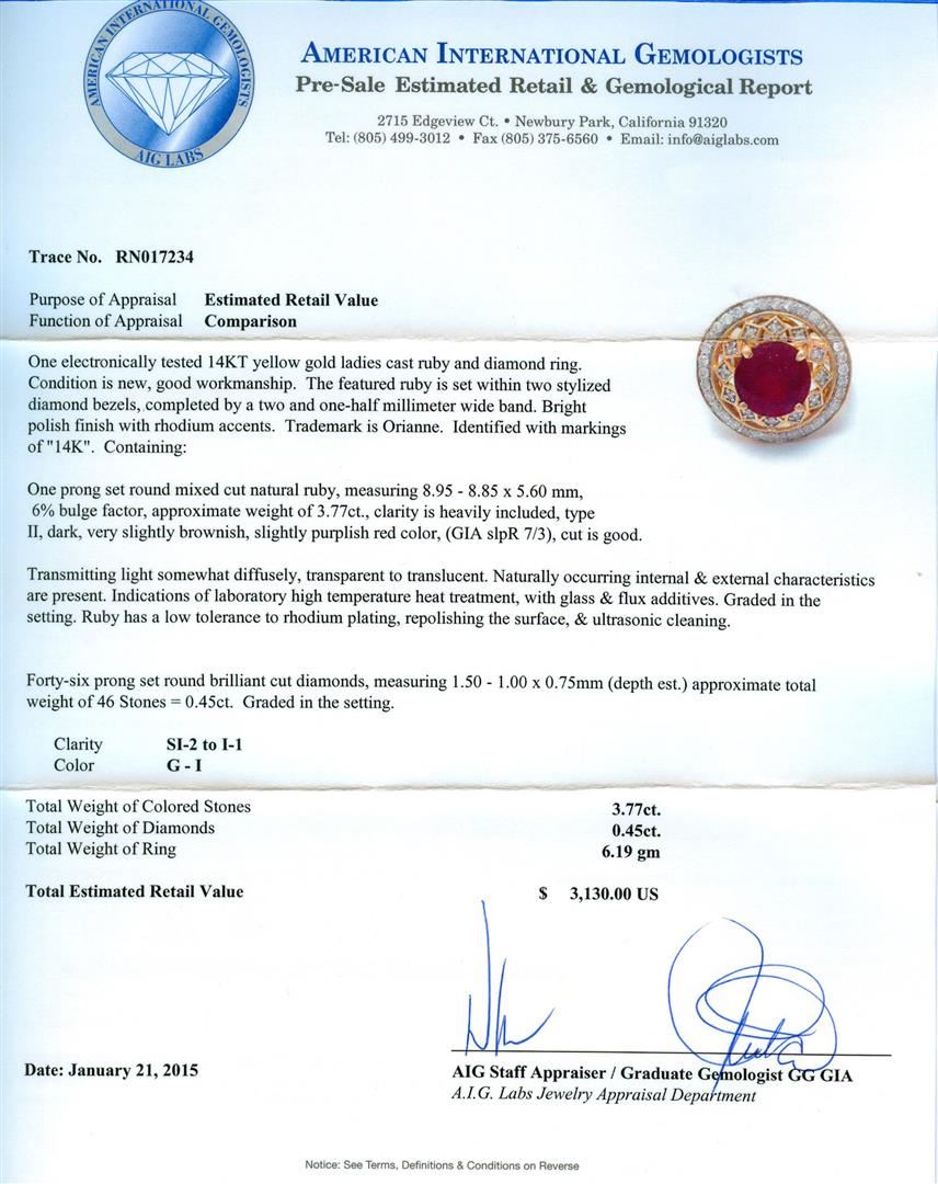 One electronically tested 14KT yellow gold ladies cast ruby and diamond ring. The featured ruby is set within two stylized diamond bezels, completed by a two and one-half millimeter wide band. Bright polish finish with rhodium accents. Trademark is Orianne. Identified with markings of "14K". Condition is new, good workmanship. Containing: One prong set round mixed cut natural ruby, measuring 8.95 - 8.85 x 5.60 mm, 6%. bulge factor, approximate weight of 3.77ct., clarity is heavily included, type II, dark, very slightly brownish, slightly purplish red color, (GIA slpR 7/3), cut is good. Transmitting light somewhat diffusely, transparent to translucent. Naturally occurring internal & external characteristics are present. Indications of laboratory high temperature heat treatment, with glass & flux additives. Graded in the setting. Ruby has a low tolerance to rhodium plating, repolishing the surface, & ultrasonic cleaning. Forty-Six prong set round brilliant cut diamonds, measuring 1.50 - 1.00 x 0.75mm (depth est.) approximate total weight of 46 Stones = 0.45ct. Graded in the setting. Clarity: SI-2 to I-1. Color: G - I. Total Weight of Colored Stones 3.77ct. Total Weight of Diamonds 0.45ct. Total Weight of Ring 6.19gm. AIG Appraised at $3,130.00.