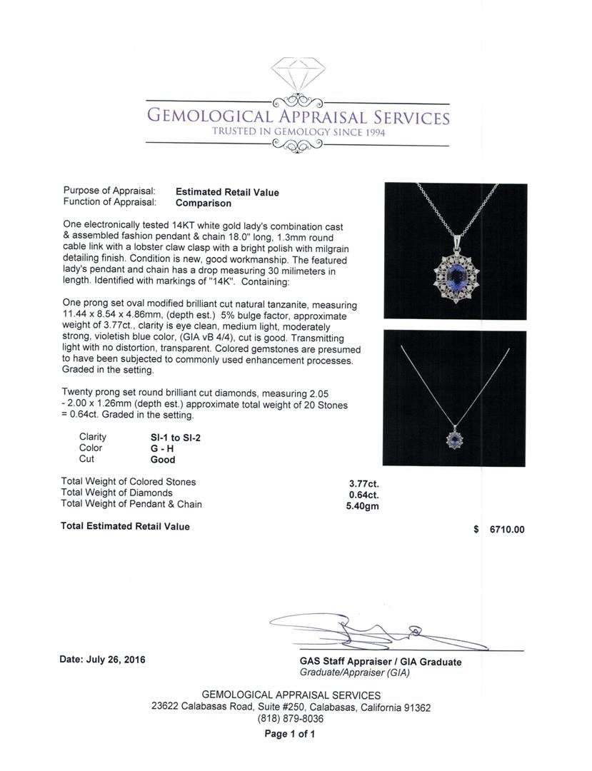 One electronically tested 14KT white gold lady's combination cast & assembled fashion pendant & chain 18.0' long, 1.3mm round cable link with a lobster claw clasp with a bright polish with milgrain detailing finish. The featured lady's pendant and chain has a drop measuring 30 millimeters in length. Identified with markings of '14K'. Condition is new, good workmanship. Containing: One prong set oval modified brilliant cut natural tanzanite, measuring 11.44 x 8.54 x 4.86mm, (depth est.) 5%. bulge factor, approximate weight of 3.77ct., clarity is eye clean, medium light, moderately strong, violetish blue color, (GIA vB 4/4), cut is good. Transmitting light with no distortion, transparent. Colored gemstones are presumed to have been subjected to commonly used enhancement processes. Graded in the setting. Twenty prong set round brilliant cut diamonds, measuring 2.05 - 2.00 x 1.26mm (depth est.) approximate total weight of 20 Stones = 0.64ct. Graded in the setting. Clarity SI-1 to SI-2. Color: G - H Cut Good. Total Weight of Colored Stones 3.77ct.. Total Weight of Diamonds 0.64ct.. Total Weight of Pendant & Chain 5.40gm. GAS Appraised at $6,710.00.