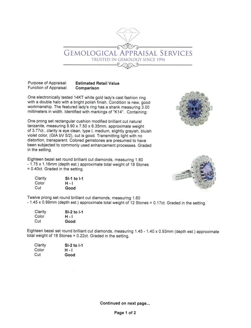 One electronically tested 14KT white gold lady's cast fashion ring with a double halo with a bright polish finish. The featured lady's ring has a shank measuring 3.00 millimeters in width. Identified with markings of "K14". Condition is new, good workmanship. Containing: One prong set rectangular cushion modified brilliant cut natural tanzanite, measuring 9.90 x 7.50 x 6.35mm, approximate weight of 3.77ct., clarity is eye clean, type I, medium, slightly grayish, bluish violet color, (GIA bV 5/2), cut is good. Transmitting light with no distortion, transparent. Colored gemstones are presumed to have been subjected to commonly used enhancement processes. Graded in the setting. Eighteen bezel set round brilliant cut diamonds, measuring 1.80 - 1.75 x 1.16mm (depth est.) approximate total weight of 18 Stones = 0.40ct. Graded in the setting. Clarity: SI-1 to I-1. Color: H - I. Cut Good Twelve prong set round brilliant cut diamonds, measuring 1.60 - 1.45 x 0.99mm (depth est.) approximate total weight of 12 Stones = 0.17ct. Graded in the setting. Clarity: SI-2 to I-1. Color: H - I. Cut Good Eighteen bezel set round brilliant cut diamonds, measuring 1.45 - 1.40 x 0.93mm (depth est.) approximate total weight of 18 Stones = 0.22ct. Graded in the setting. Clarity: SI-2 to I-1. Color: H - I. Cut Good. Total Weight of Colored Stones 3.77ct. Total Weight of Diamonds 0.79ct. Total Weight of Ring 7.70gm. GAS Appraised at $7,195.00.