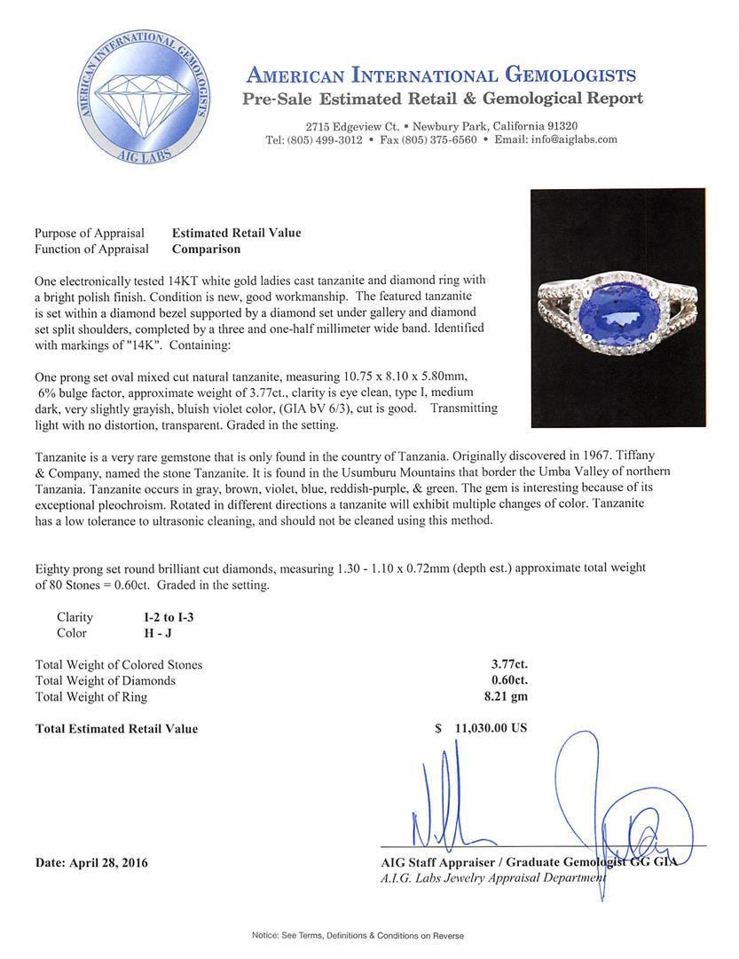 One electronically tested 14KT white gold ladies cast tanzanite and diamond ring with a bright polish finish. The featured tanzanite is set within a diamond bezel supported by a diamond set under gallery and diamond set split shoulders, completed by a three and one-half millimeter wide band. Identified with markings of "14K". Condition is new, good workmanship. Containing: One prong set oval mixed cut natural tanzanite, measuring 10.75 x 8.10 x 5.80mm, 6%. bulge factor, approximate weight of 3.77ct., clarity is eye clean, type I, medium dark, very slightly grayish, bluish violet color, (GIA bV 6/3), cut is good. Transmitting light with no distortion, transparent. Graded in the setting. Tanzanite is a very rare gemstone that is only found in the country of Tanzania. Originally discovered in 1967. Tiffany & Company, named the stone Tanzanite. It is found in the Usumburu Mountains that border the Umba Valley of northern Tanzania. Tanzanite occurs in gray, brown, violet, blue, reddish-purple, & green. The gem is interesting because of its exceptional pleochroism. Rotated in different directions a tanzanite will exhibit multiple changes of color. Tanzanite has a low tolerance to ultrasonic cleaning, and should not be cleaned using this method. Eighty prong set round brilliant cut diamonds, measuring 1.30 - 1.10 x 0.72mm (depth est.) approximate total weight of 80 Stones = 0.60ct. Graded in the setting. Clarity: I-2 to I-3. Color: H - J. Total Weight of Colored Stones 3.77ct. Total Weight of Diamonds 0.60ct. Total Weight of Ring 8.21gm.