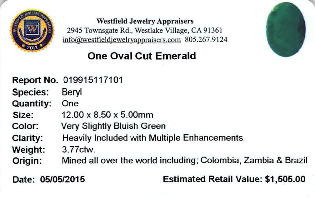 One oval mixed cut natural emerald, measuring 12.00 x 8.50 x 5.00mm, exact weight 3.77ct., clarity is heavily included, type III, medium dark, very slightly grayish, very slightly bluish green color, (GIA vslbG 6/3) Indications of multiple laboratory enhancements, including high temperature heat treatment. Westfield Appraised at $1,505.00.