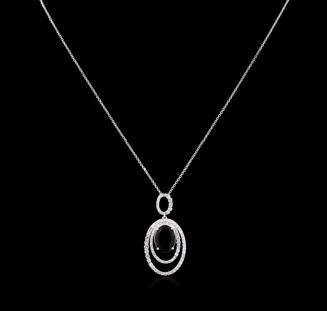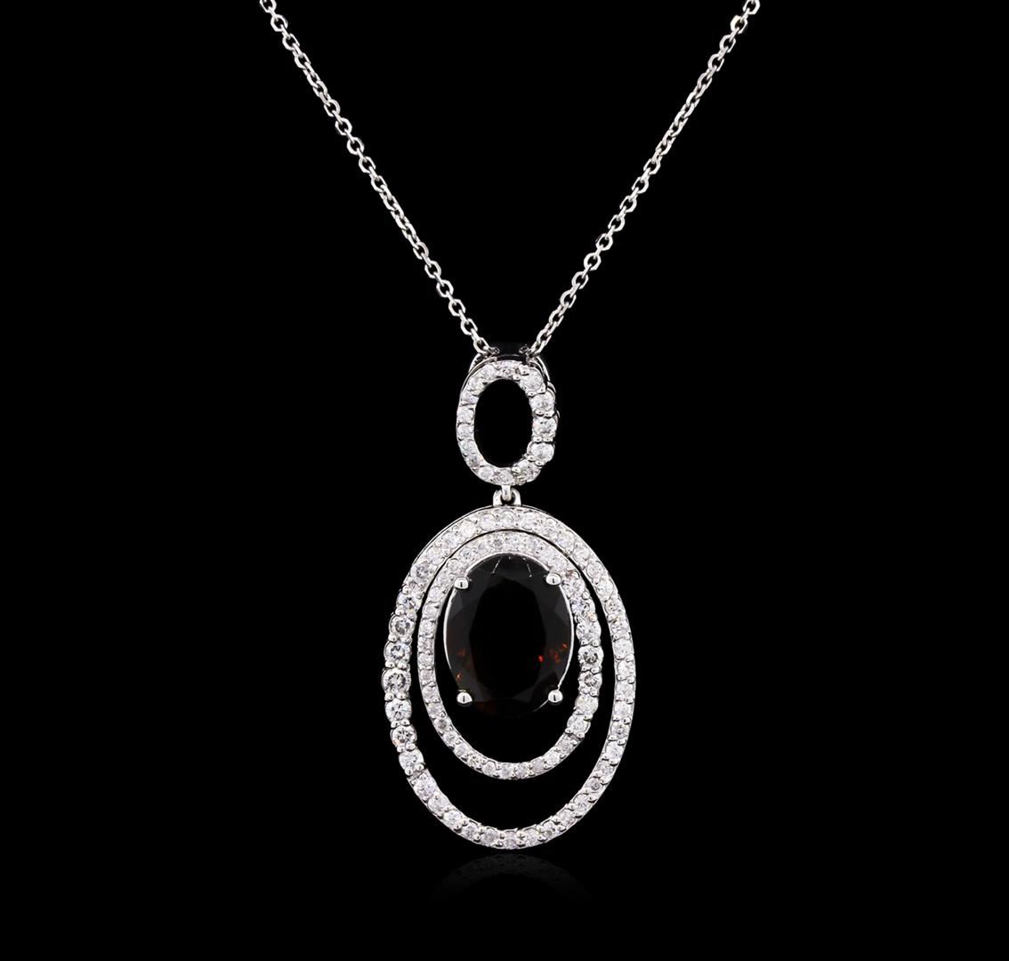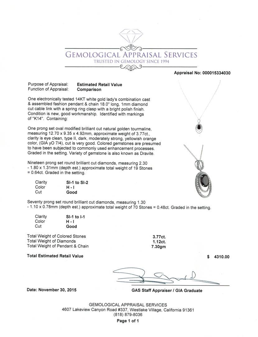 One electronically tested 14KT white gold lady's combination cast & assembled fashion pendant & chain 18.0" long, 1mm diamond cut cable link with a spring ring clasp with a bright polish finish. Identified with markings of "K14". Condition is new, good workmanship. Containing: One prong set oval modified brilliant cut natural golden tourmaline, measuring 12.70 x 9.35 x 4.92mm, approximate weight of 3.77ct., clarity is eye clean, type II, dark, moderately strong, yellowish orange color, (GIA yO 7/4), cut is very good. Colored gemstones are presumed to have been subjected to commonly used enhancement processes. Graded in the setting. Variety of gemstone is also known as Dravite. Nineteen prong set round brilliant cut diamonds, measuring 2.30 - 1.80 x 1.31mm (depth est.) approximate total weight of 19 Stones = 0.64ct. Graded in the setting. Clarity: SI-1 to SI-2 . Color: H - I. Cut Good Seventy prong set round brilliant cut diamonds, measuring 1.30 - 1.10 x 0.78mm (depth est.) approximate total weight of 70 Stones = 0.48ct. Graded in the setting. Clarity: SI-1 to I-1 . Color: H - I. Cut Good. Total Weight of Colored Stones 3.77ct.. Total Weight of Diamonds 1.12ct.. Total Weight of Pendant & Chain 7.30gm at $ 4310.00 GAS Appraised.