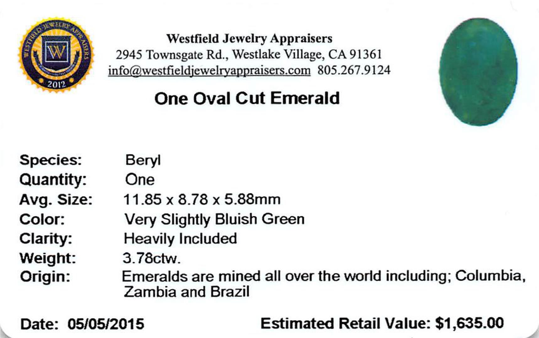 One oval mixed cut natural emerald, measuring 11.85 x 8.78 x 5.88mm, approximate weight of 3.78ct., clarity is heavily included, type III, medium dark, very slightly grayish, very slightly bluish green color, (GIA vslbG 6/3), cut is good. Indications of multiple laboratory enhancements, including high temperature heat treatment. Westfield Appraised at $1,635.00.