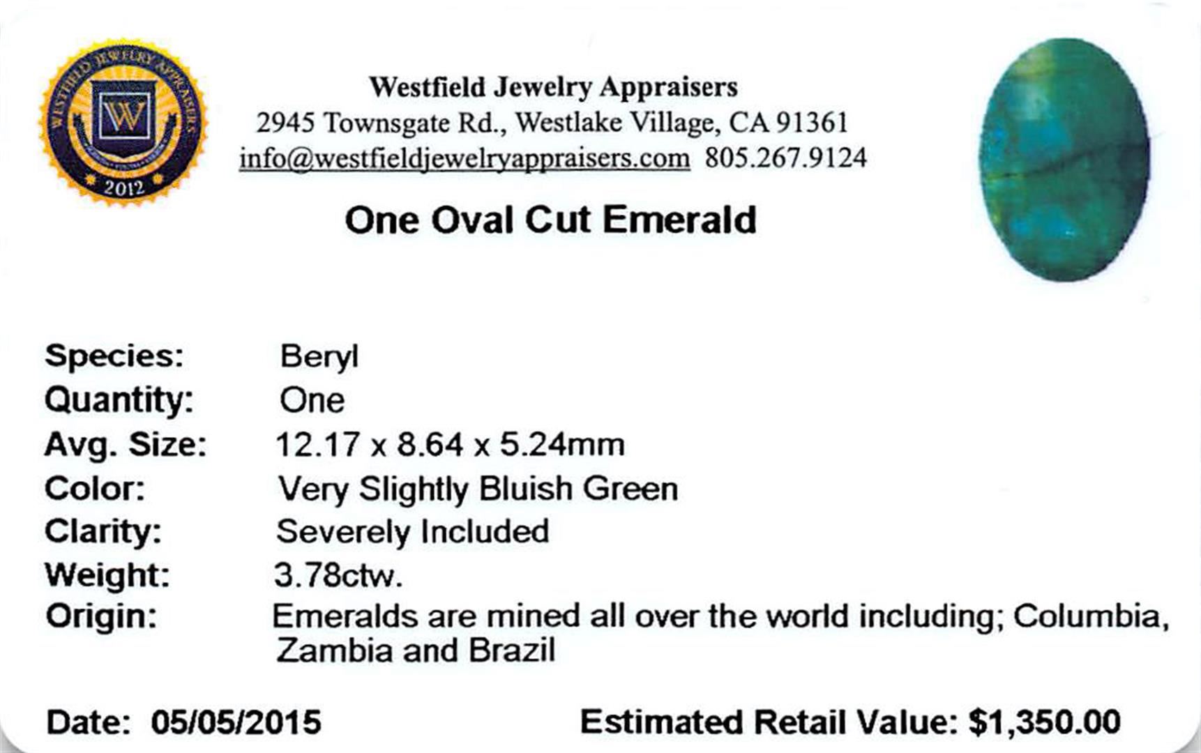 One oval mixed cut natural emerald, measuring 12.17 x 8.64 x 5.24mm, approximate weight of 3.78ct., clarity is severely included, type III, medium dark, very slightly grayish, bluish green color, (GIA bG 6/3), cut is good. Indications of multiple laboratory enhancements, including high temperature heat treatment. Westfield Appraised at $1,350.00.