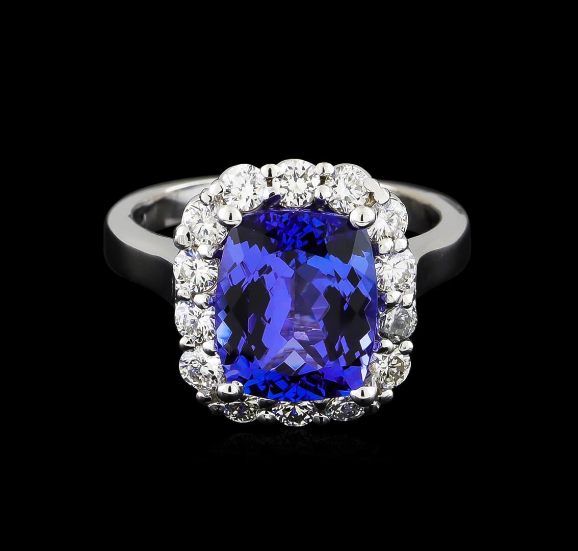 One electronically tested 14KT white gold ladies cast tanzanite and diamond ring with a bright polish finish. The featured tanzanite is set within a diamond bezel, completed by a two millimeter wide band. Identified with markings of "14K". Condition is new, good workmanship. Containing: One prong set rectangular cushion mixed cut natural tanzanite, measuring 10.60 x 8.70 x 5.00mm, 4%. bulge factor, approximate weight of 3.78ct., clarity is eye clean, type I, medium dark, very slightly grayish, bluish violet color, (GIA bV 6/3), cut is good. Transmitting light with no distortion, transparent. Graded in the setting. Tanzanite is a very rare gemstone that is only found in the country of Tanzania. Originally discovered in 1967. Tiffany & Company, named the stone Tanzanite. It is found in the Usumburu Mountains that border the Umba Valley of northern Tanzania. Tanzanite occurs in gray, brown, violet, blue, reddish-purple, & green. The gem is interesting because of its exceptional pleochroism. Rotated in different directions a tanzanite will exhibit multiple changes of color. Tanzanite has a low tolerance to ultrasonic cleaning, and should not be cleaned using this method. Fourteen prong set round brilliant cut diamonds, measuring 2.50 - 2.50 x 1.50mm (depth est.) approximate. Total Weight of 14 Stones = 0.85ct. The clarity grade reflects the entire range of clarity for this group. Graded in the setting. Clarity: SI-1 to I-2. Color: G - H. Total Weight of Colored Stones 3.78ct. Total Weight of Diamonds 0.85ct. Total Weight of Ring 6.00gm. AIG Appraised at $11,250.00.
