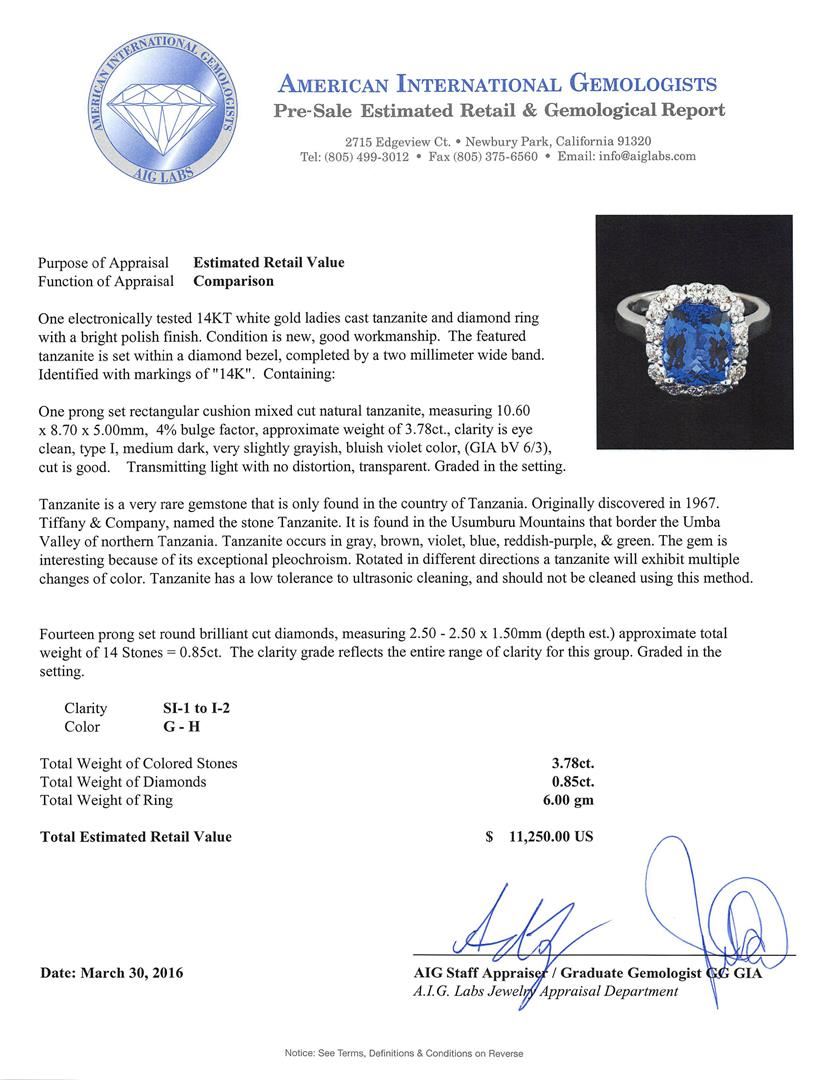 One electronically tested 14KT white gold ladies cast tanzanite and diamond ring with a bright polish finish. The featured tanzanite is set within a diamond bezel, completed by a two millimeter wide band. Identified with markings of "14K". Condition is new, good workmanship. Containing: One prong set rectangular cushion mixed cut natural tanzanite, measuring 10.60 x 8.70 x 5.00mm, 4%. bulge factor, approximate weight of 3.78ct., clarity is eye clean, type I, medium dark, very slightly grayish, bluish violet color, (GIA bV 6/3), cut is good. Transmitting light with no distortion, transparent. Graded in the setting. Tanzanite is a very rare gemstone that is only found in the country of Tanzania. Originally discovered in 1967. Tiffany & Company, named the stone Tanzanite. It is found in the Usumburu Mountains that border the Umba Valley of northern Tanzania. Tanzanite occurs in gray, brown, violet, blue, reddish-purple, & green. The gem is interesting because of its exceptional pleochroism. Rotated in different directions a tanzanite will exhibit multiple changes of color. Tanzanite has a low tolerance to ultrasonic cleaning, and should not be cleaned using this method. Fourteen prong set round brilliant cut diamonds, measuring 2.50 - 2.50 x 1.50mm (depth est.) approximate. Total Weight of 14 Stones = 0.85ct. The clarity grade reflects the entire range of clarity for this group. Graded in the setting. Clarity: SI-1 to I-2. Color: G - H. Total Weight of Colored Stones 3.78ct. Total Weight of Diamonds 0.85ct. Total Weight of Ring 6.00gm. AIG Appraised at $11,250.00.
