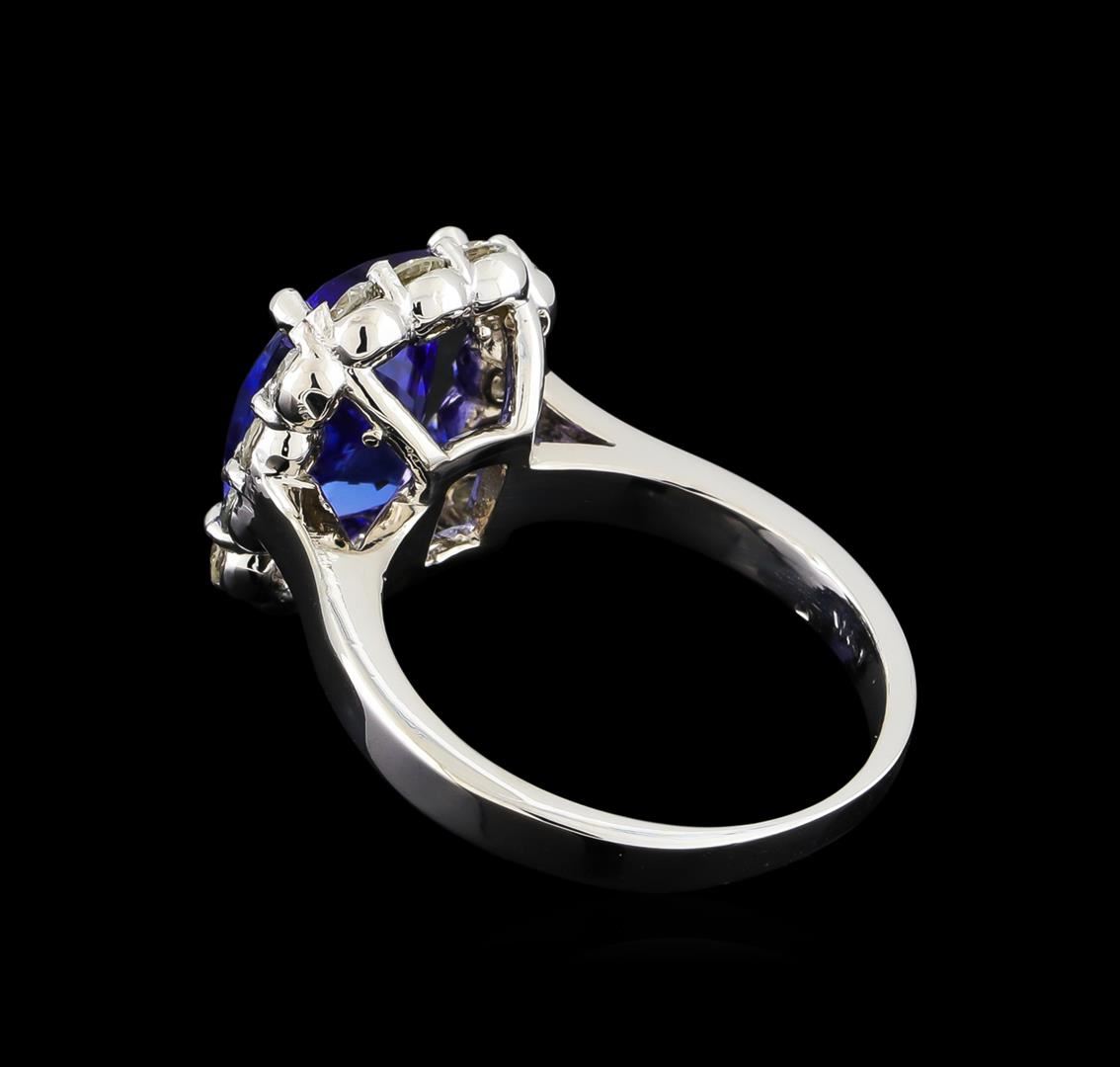 One electronically tested 14KT white gold ladies cast tanzanite and diamond ring with a bright polish finish. The featured tanzanite is set within a diamond bezel, completed by a two millimeter wide band. Identified with markings of "14K". Condition is new, good workmanship. Containing: One prong set rectangular cushion mixed cut natural tanzanite, measuring 10.60 x 8.70 x 5.00mm, 4%. bulge factor, approximate weight of 3.78ct., clarity is eye clean, type I, medium dark, very slightly grayish, bluish violet color, (GIA bV 6/3), cut is good. Transmitting light with no distortion, transparent. Graded in the setting. Tanzanite is a very rare gemstone that is only found in the country of Tanzania. Originally discovered in 1967. Tiffany & Company, named the stone Tanzanite. It is found in the Usumburu Mountains that border the Umba Valley of northern Tanzania. Tanzanite occurs in gray, brown, violet, blue, reddish-purple, & green. The gem is interesting because of its exceptional pleochroism. Rotated in different directions a tanzanite will exhibit multiple changes of color. Tanzanite has a low tolerance to ultrasonic cleaning, and should not be cleaned using this method. Fourteen prong set round brilliant cut diamonds, measuring 2.50 - 2.50 x 1.50mm (depth est.) approximate. Total Weight of 14 Stones = 0.85ct. The clarity grade reflects the entire range of clarity for this group. Graded in the setting. Clarity: SI-1 to I-2. Color: G - H. Total Weight of Colored Stones 3.78ct. Total Weight of Diamonds 0.85ct. Total Weight of Ring 6.00gm. AIG Appraised at $11,250.00.