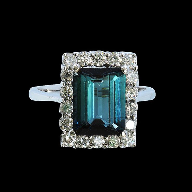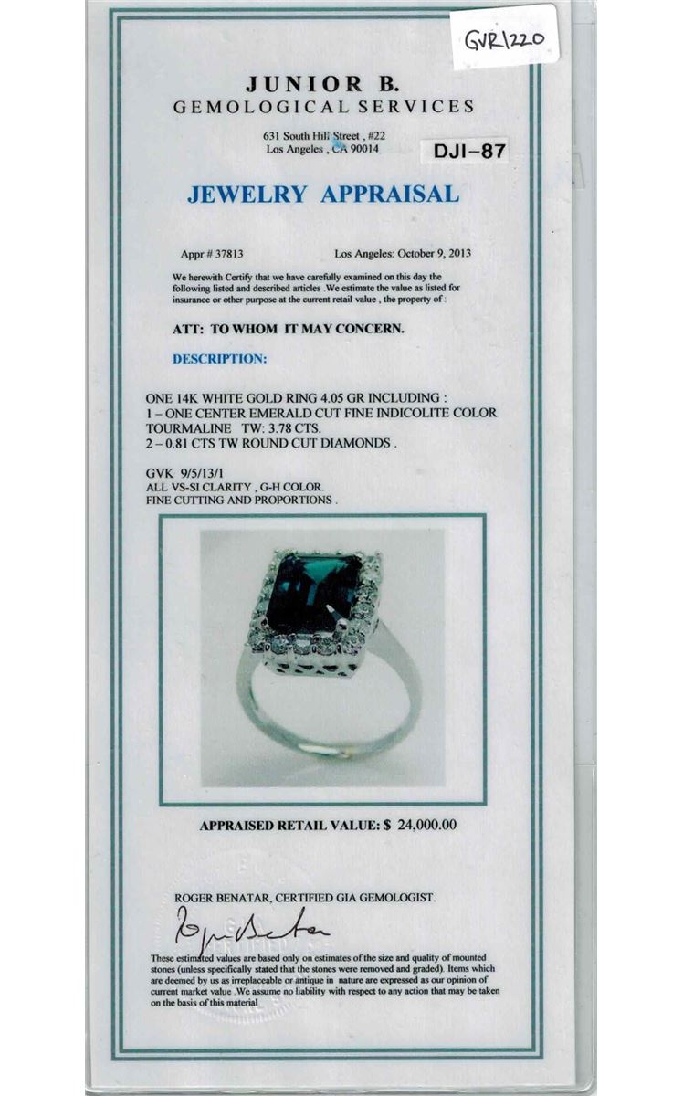 14K WHITE GOLD NATURAL INDICOLITE RING :4.05 GRAMS/INDICOLITE :3.78CT/DIAMOND RD :0.81CT/#GVR1220