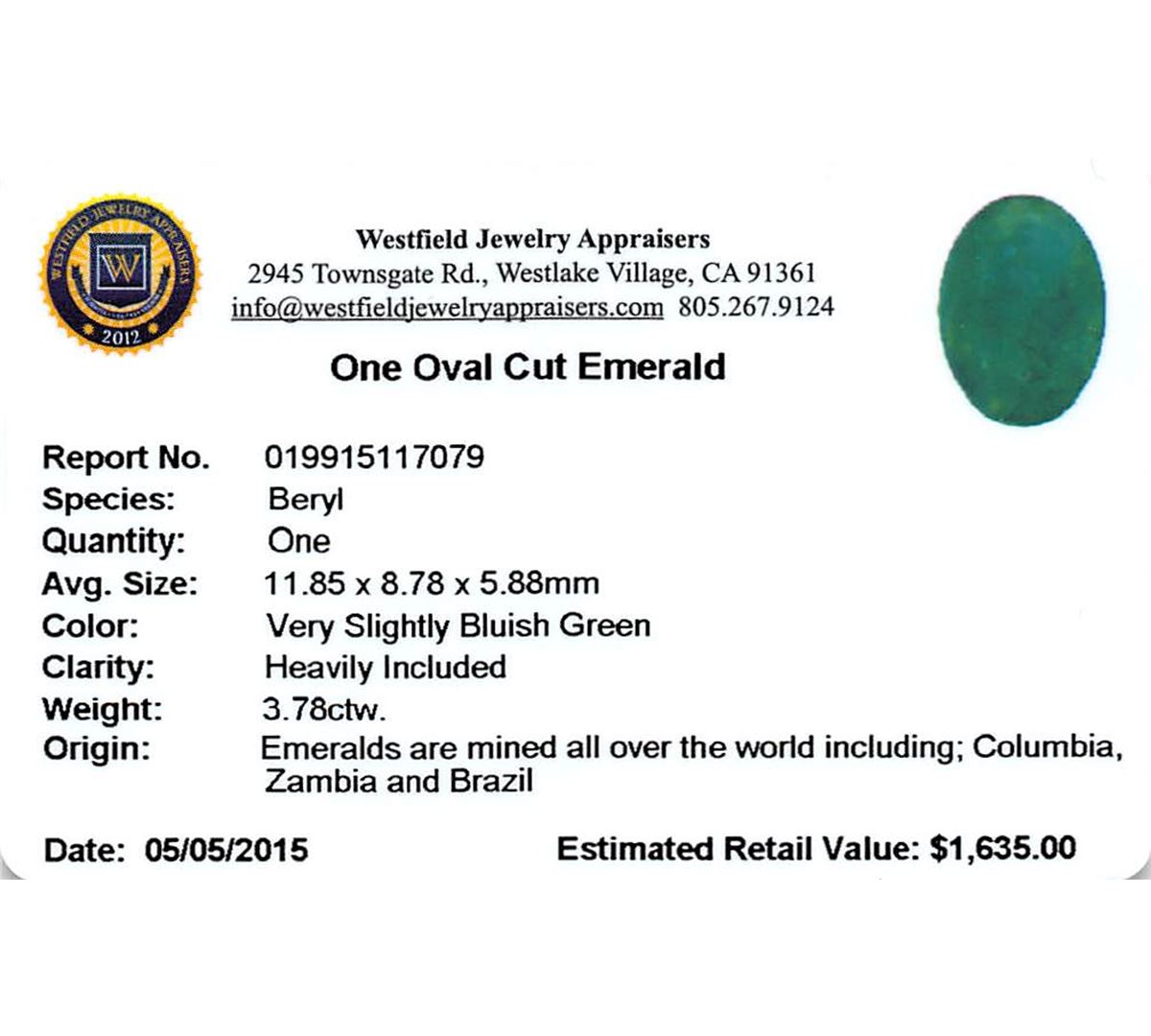One oval mixed cut natural emerald, measuring 11.85 x 8.78 x 5.88mm, approximate weight of 3.78ct., clarity is heavily included, type III, medium dark, very slightly grayish, very slightly bluish green color, (GIA vslbG 6/3), cut is good. Indications of multiple laboratory enhancements, including high temperature heat treatment. Westfield Appraised at $1,635.00.