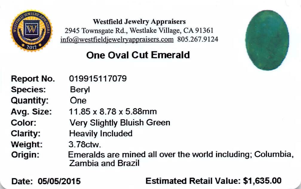 One oval mixed cut natural emerald, measuring 11.85 x 8.78 x 5.88mm, approximate weight of 3.78ct., clarity is heavily included, type III, medium dark, very slightly grayish, very slightly bluish green color, (GIA vslbG 6/3), cut is good. Indications of multiple laboratory enhancements, including high temperature heat treatment. Westfield Appraised at $1,635.00.