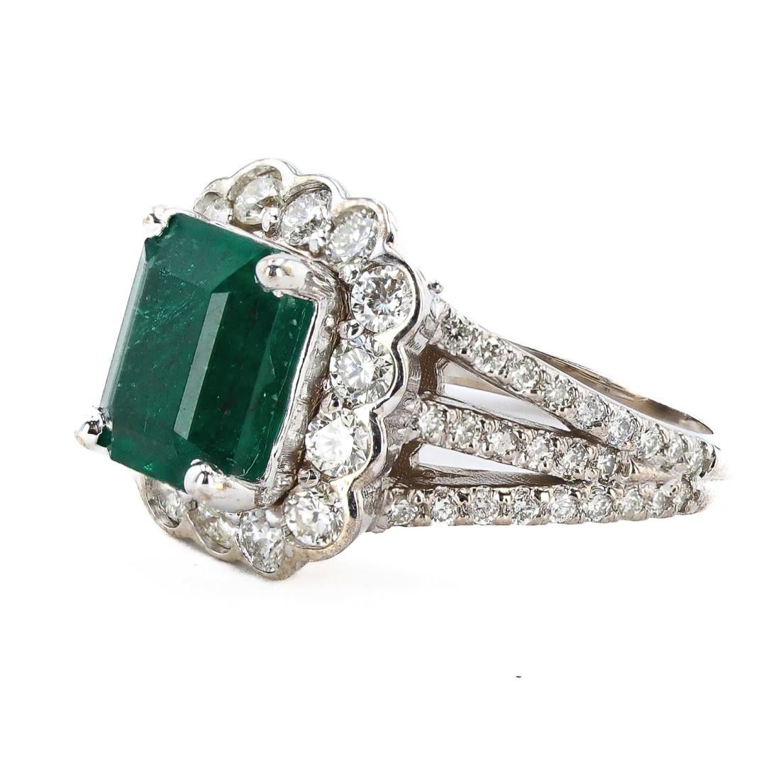 One polished. stamped. and tested 14K white gold ring with a bright finish. The ring is mounted with: 1 genuine emerald center stone weighing approximately 3.79 carat, and 62 genuine round diamonds weighing approximately 1.34 carats. This item weighs 8.1 grams, condition is new, excellent workmanship. #MAIN GEMSTONE# Species: Natural Beryl Variety: Emerald Shape: Rectangular Cut Cornered Cutting Style: Step Cut Measurements: 9.6 x 7.6mm Weight: 3.79 carat Color: Green Cut Grade: Very Good Refractive Index: 1.564 - 1.595 DR Birefringence: 0.005 to 0.009 Hardness: 7.5 - 8 #ADJACENT GEMSTONES ON RING# Identity: Natural Diamond Shape: Round Cutting Style: Brilliant Cut Quantity: 62 Diamonds Measurements: 1.3 - 2.6mm Total Weight: 1.34 carats Color Grade: G-H Clarity Grade: VS2-SI2 Refractive Index: 2.417 Hardness: 10 EMERALD WEIGHT: 3.79 ct TOTAL DIAMOND WEIGHT: 1.34 cts WEIGHT OF ITEM: 8.1 grams GOLD CONTENT: 14K White Gold #LREF-1898