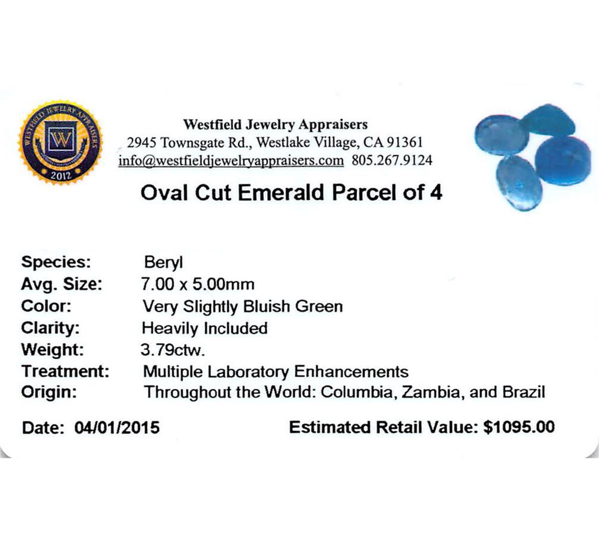 Four oval mixed cut natural emeralds exact total weight 3.79ct., clarity is heavily included, type III, medium dark, very slightly grayish, very slightly bluish green color, (GIA vslbG 6/3), cut is good. Westfield Appraised at $1,095.00.