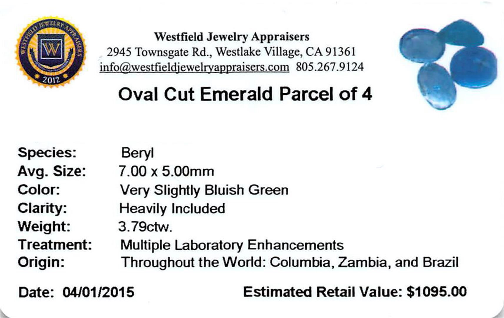 Four oval mixed cut natural emeralds exact total weight 3.79ct., clarity is heavily included, type III, medium dark, very slightly grayish, very slightly bluish green color, (GIA vslbG 6/3), cut is good. Westfield Appraised.