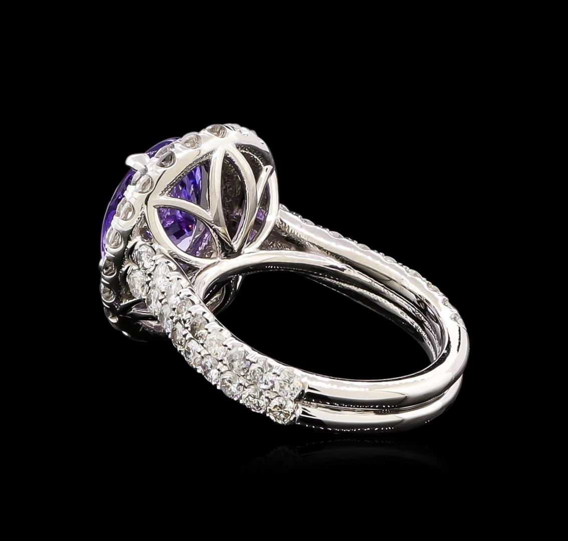 One electronically tested 14KT white gold ladies cast tanzanite and diamond ring with a bright polish finish. The featured tanzanite is set within tiered diamond bezels supported by a tuliped under gallery and diamond ribbon shoulders, completed by a four millimeter wide band. Identified with markings of "14K". Condition is new, good workmanship. Containing: One prong set oval mixed cut natural tanzanite, measuring 11.00 x 8.90 x 5.50mm, approximate weight of 3.79ct., clarity is eye clean, type I, medium, very slightly grayish, violet color, (GIA V 5/3), cut is good. Transmitting light with no distortion, transparent. Graded in the setting. Tanzanite is a very rare gemstone that is only found in the country of Tanzania. Originally discovered in 1967. Tiffany & Company, named the stone Tanzanite. It is found in the Usumburu Mountains that border the Umba Valley of northern Tanzania. Tanzanite occurs in gray, brown, violet, blue, reddish-purple, & green. The gem is interesting because of its exceptional pleochroism. Rotated in different directions a tanzanite will exhibit multiple changes of color. Tanzanite has a low tolerance to ultrasonic cleaning, and should not be cleaned using this method. Seventy-Four prong set round brilliant cut diamonds, measuring 2.00 - 1.90 x 1.17mm (depth est.) approximate total weight of 74 Stones = 2.10ct. Graded in the setting. Clarity: SI-2 to I-2. Color: G - I. Total Weight of Colored Stones 3.79ct. Total Weight of Diamonds 2.10ct. Total Weight of Ring 7.81gm. AIG Appraised at $12,520.00.