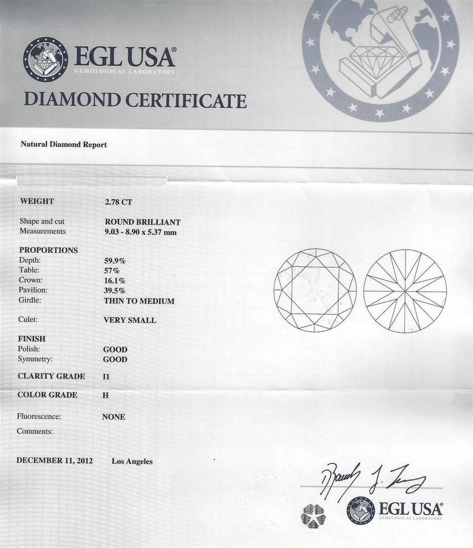 One ring featuring: 18KT white gold weighing 5.84 grams containing diamonds with a total weight of 3.80ct. Center Diamond: Weight: 2.78ct. Shape and cut: Round Brilliant. Measurements: 9.03 - 8.90 x 5.37mm. Depth: 59.9%. Table: 57%. Crown: 16.1%. Pavilion: 39.5%. Girdle: Thin To Medium. Culet: Very Small. Polish: Good. Symmetry: Good. Clarity Grade: I1. Color Grade: H. Fluorescence: None. UGS Appraised at $25,620.00.