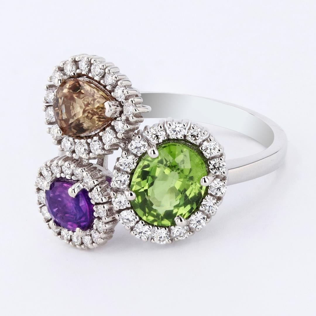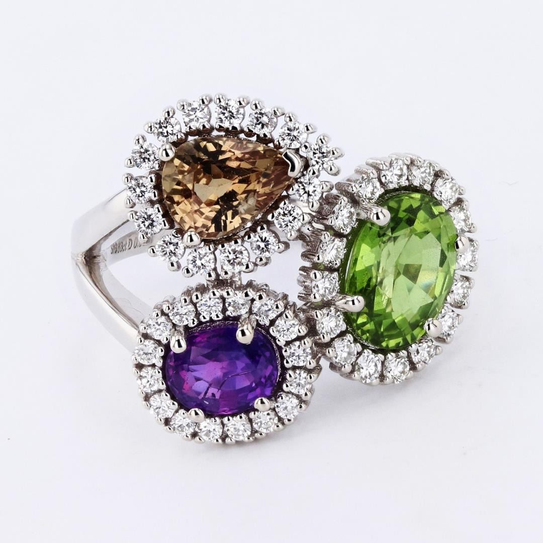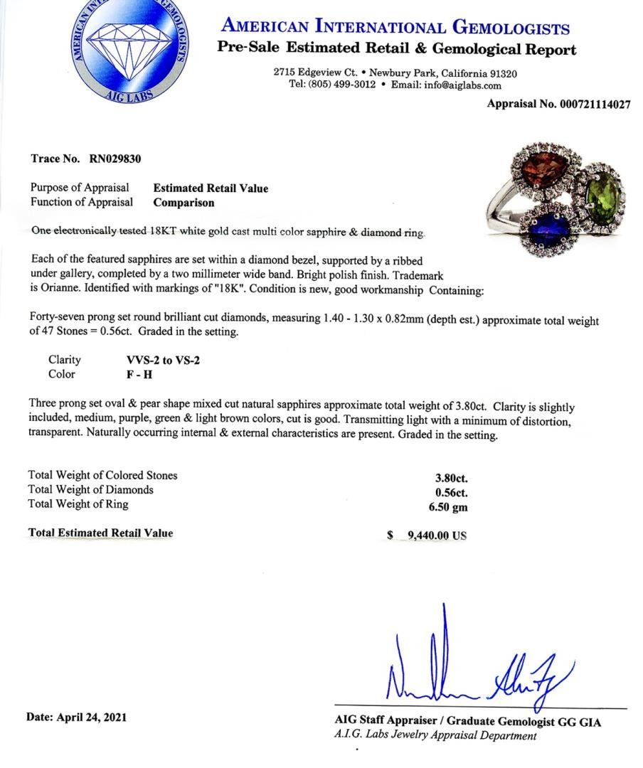 One electronically tested 18KT white gold cast multi color sapphire & diamond ring. Each of the featured sapphires are set within a diamond bezel, supported by a ribbed under gallery, completed by a two millimeter wide band. Bright polish finish. Trademark is Orianne. Identified with markings of "18K". Condition is new, good workmanship Containing: Forty-seven prong set round brilliant cut diamonds, measuring 1.40 - 1.30 x 0.82mm (depth est.) approximate total weight of 47 Stones = 0.56ctw. Graded in the setting. Clarity VVS2 to VS2 Color F - H Three prong set oval & pear shape mixed cut natural sapphires approximate total weight of 3.80ct. Clarity is slightly included, medium, purple, green & light brown colors, cut is good. Transmitting light with a minimum of distortion, transparent. Naturally occurring internal & external characteristics are present. Graded in the setting. Total Weight of Colored Stones 3.80ctw. Total Weight of Diamonds 0.56ctw. Total Weight of Ring 6.50 gm #LREF-4799
