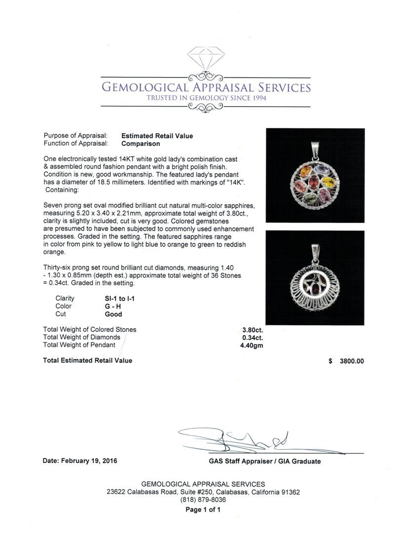 One electronically tested 14KT white gold lady's combination cast & assembled round fashion pendant with a bright polish finish. The featured lady's pendant has a diameter of 18.5 millimeters. Identified with markings of "14K". Condition is new, good workmanship. Containing: Seven prong set oval modified brilliant cut natural multi-color sapphires, measuring 5.20 x 3.40 x 2.21mm, approximate total weight of 3.80ct., clarity is slightly included, cut is very good. Colored gemstones are presumed to have been subjected to commonly used enhancement processes. Graded in the setting. The featured sapphires range in color from pink to yellow to light blue to orange to green to reddish orange. Thirty-Six prong set round brilliant cut diamonds, measuring 1.40 - 1.30 x 0.85mm (depth est.) approximate total weight of 36 Stones = 0.34ct. Graded in the setting. Clarity: SI-1 to I-1. Color: G - Good. Total Weight of Colored Stones 3.80ct. Total Weight of Diamonds 0.34ct. Total Weight of Pendant 4.40gm. GAS Appraised at $3,800.00.