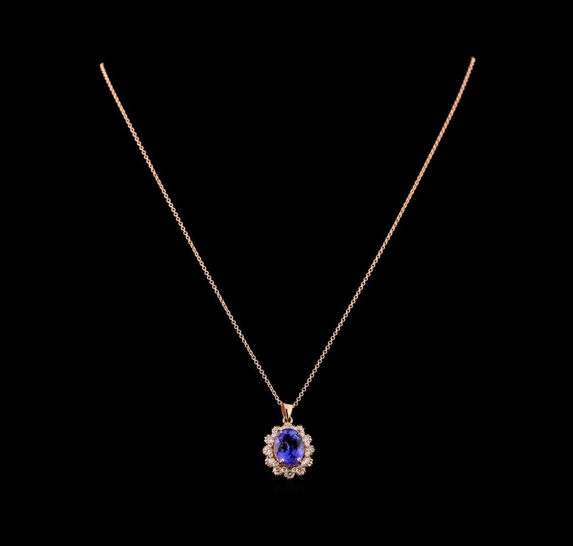 One electronically tested 14KT rose gold lady's combination cast & assembled fashion pendant & chain 18.0' long, 1.3mm round cable link with a lobster claw clasp with a bright polish finish. The featured lady's pendant and chain has a drop measuring 24 millimeters in length. Identified with markings of '14K'. Condition is new, good workmanship. Containing: One prong set oval modified brilliant cut natural tanzanite, measuring 10.93 x 8.56 x 5.71mm, (depth est.) approximate weight of 3.80ct., clarity is eye clean, medium, moderately strong, bluish violet color, (GIA bV 5/4), cut is very good. Transmitting light with no distortion, transparent. Colored gemstones are presumed to have been subjected to commonly used enhancement processes. Graded in the setting. Twelve prong set round brilliant cut diamonds, measuring 2.50 - 2.40 x 1.51mm (depth est.) approximate total weight of 12 Stones = 0.65ct. Graded in the setting. Clarity SI-1 to I-1. Color: I - J Cut Good Twelve prong set round brilliant cut diamonds, measuring 1.50 - 1.45 x 0.92mm (depth est.) approximate total weight of 12 Stones = 0.15ct. Graded in the setting. Clarity SI-1 to SI-2. Color: H - I Cut Good. Total Weight of Colored Stones 3.80ct.. Total Weight of Diamonds 0.80ct.. Total Weight of Pendant & Chain 5.50gm. GAS Appraised at $8,370.00.