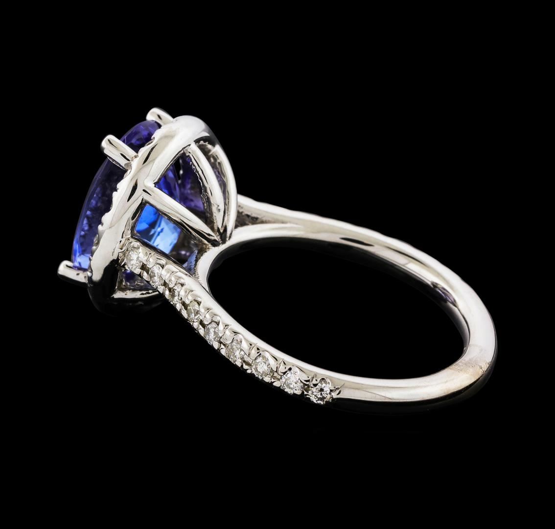 One Tanzanite and Diamond Ring featuring: 14KT White Gold with a total weight of 5.11 grams, One Tanzanite stone with a total weight of 3.80ct, and 34 Diamonds with a total weight of 0.46ctw.