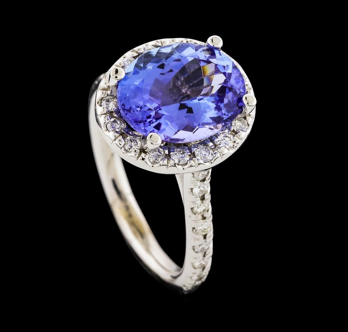One Tanzanite and Diamond Ring featuring: 14KT White Gold with a total weight of 5.11 grams, One Tanzanite stone with a total weight of 3.80ct, and 34 Diamonds with a total weight of 0.46ctw.