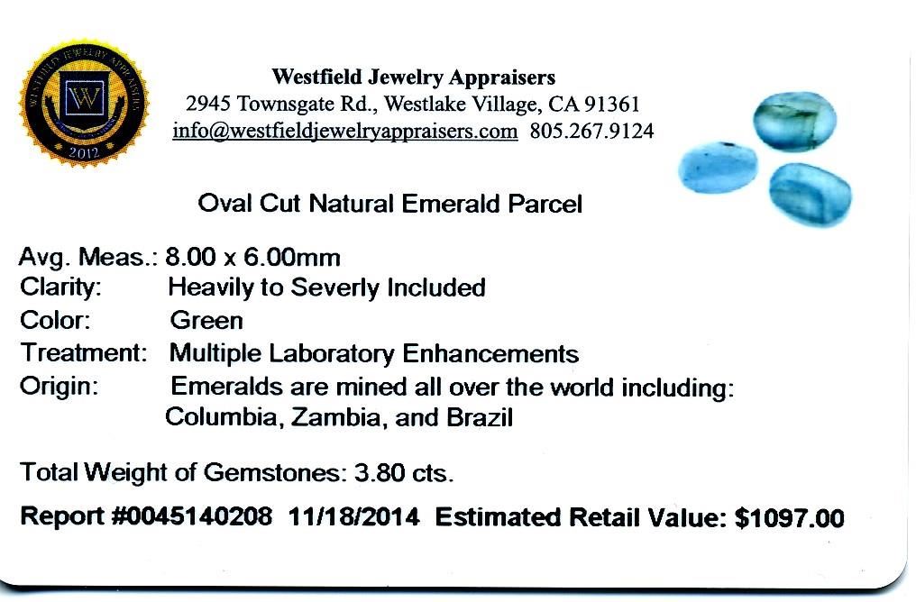 3.80cts. Oval Cut Natural Emerald Parcel Westfield Appraised at $1,097.00.