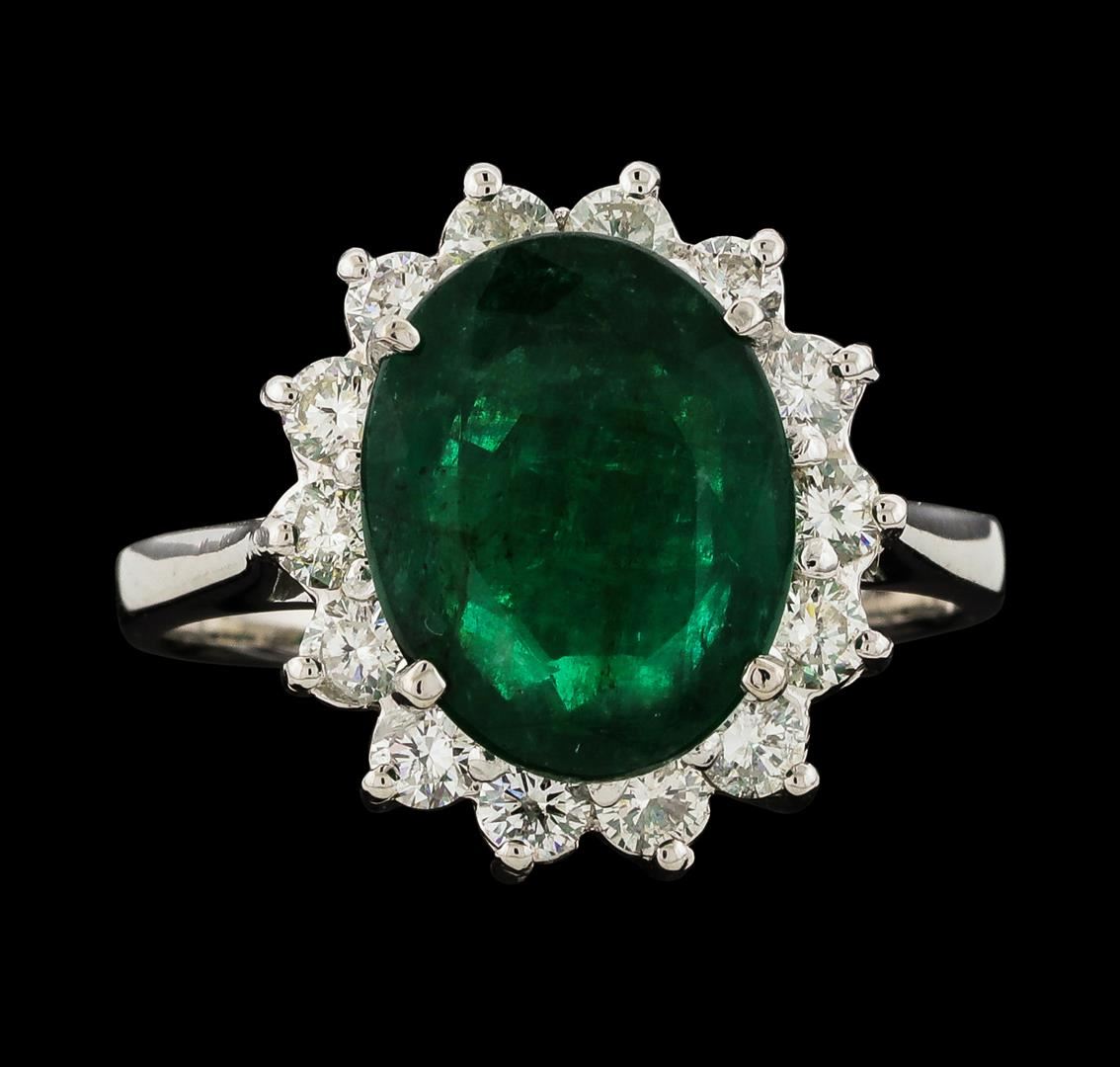 One electronically tested 14KT white gold lady's cast fashion ring with a basket halo with a bright polish finish. The featured lady's ring has a shank measuring 1.85 millimeters wide. Identified with markings of 'K14'. Condition is new, good workmanship. Containing: One prong set oval modified mixed cut natural emerald, measuring 11.52 x 9.00 x 4.97mm, (depth est.) 20%. bulge factor, approximate weight of 3.81ct., clarity is heavily included, medium dark, moderately strong, green color, (GIA G 6/4), cut is good. Transmitting light somewhat diffusely, semi-transparent to translucent. Naturally occurring internal & external characteristics are present. Indications of oil residue. Colored gemstones are presumed to have been subjected to commonly used enhancement processes. Graded in the setting. Fourteen prong set round brilliant cut diamonds, measuring 2.40 - 2.30 x 1.46mm (depth est.) approximate total weight of 14 Stones = 0.70ct. Graded in the setting. Clarity SI-1 to I-1. Color: G - I Cut Good. Total Weight of Colored Stones 3.81ct.. Total Weight of Diamonds 0.70ct.. Total Weight of Ring 4.10gm. GAS Appraised at $6,760.00.