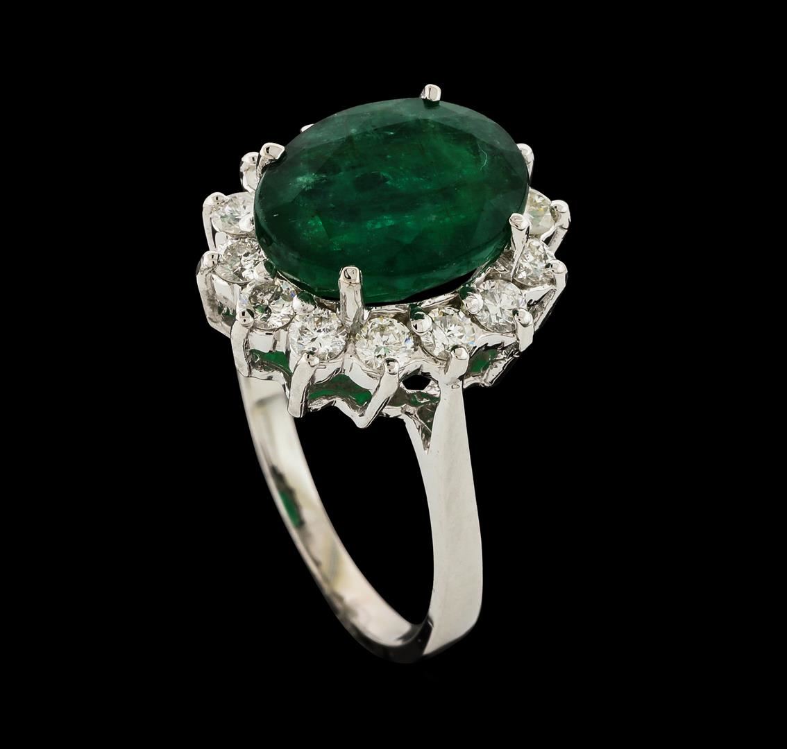 One electronically tested 14KT white gold lady's cast fashion ring with a basket halo with a bright polish finish. The featured lady's ring has a shank measuring 1.85 millimeters wide. Identified with markings of 'K14'. Condition is new, good workmanship. Containing: One prong set oval modified mixed cut natural emerald, measuring 11.52 x 9.00 x 4.97mm, (depth est.) 20%. bulge factor, approximate weight of 3.81ct., clarity is heavily included, medium dark, moderately strong, green color, (GIA G 6/4), cut is good. Transmitting light somewhat diffusely, semi-transparent to translucent. Naturally occurring internal & external characteristics are present. Indications of oil residue. Colored gemstones are presumed to have been subjected to commonly used enhancement processes. Graded in the setting. Fourteen prong set round brilliant cut diamonds, measuring 2.40 - 2.30 x 1.46mm (depth est.) approximate total weight of 14 Stones = 0.70ct. Graded in the setting. Clarity SI-1 to I-1. Color: G - I Cut Good. Total Weight of Colored Stones 3.81ct.. Total Weight of Diamonds 0.70ct.. Total Weight of Ring 4.10gm. GAS Appraised at $6,760.00.