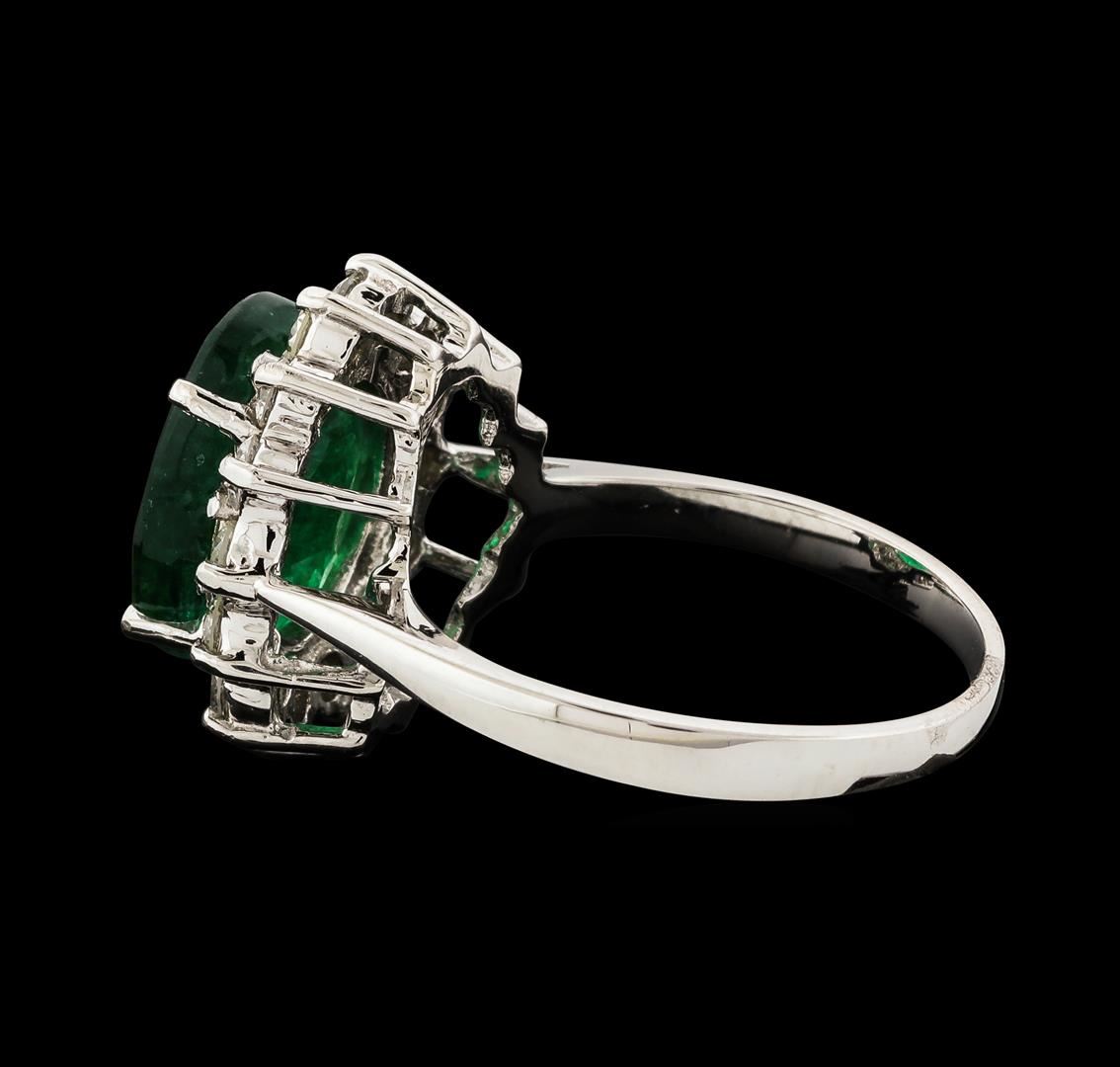 One electronically tested 14KT white gold lady's cast fashion ring with a basket halo with a bright polish finish. The featured lady's ring has a shank measuring 1.85 millimeters wide. Identified with markings of 'K14'. Condition is new, good workmanship. Containing: One prong set oval modified mixed cut natural emerald, measuring 11.52 x 9.00 x 4.97mm, (depth est.) 20%. bulge factor, approximate weight of 3.81ct., clarity is heavily included, medium dark, moderately strong, green color, (GIA G 6/4), cut is good. Transmitting light somewhat diffusely, semi-transparent to translucent. Naturally occurring internal & external characteristics are present. Indications of oil residue. Colored gemstones are presumed to have been subjected to commonly used enhancement processes. Graded in the setting. Fourteen prong set round brilliant cut diamonds, measuring 2.40 - 2.30 x 1.46mm (depth est.) approximate total weight of 14 Stones = 0.70ct. Graded in the setting. Clarity SI-1 to I-1. Color: G - I Cut Good. Total Weight of Colored Stones 3.81ct.. Total Weight of Diamonds 0.70ct.. Total Weight of Ring 4.10gm. GAS Appraised at $6,760.00.