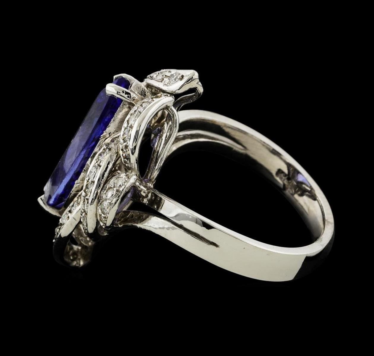 One electronically tested 14KT white gold lady's cast fashion ring with a freeform diamond wreath with a bright polish finish. The featured lady's ring has a split shank measuring 3.36 millimeters wide. Identified with markings of 'K14'. Condition is new, good workmanship. Containing: One prong set marquise modified brilliant cut natural tanzanite, measuring 16.40 x 7.18 x 4.67mm, (depth est.) 10%. bulge factor, approximate weight of 3.81ct., clarity is eye clean, medium, moderately strong, violetish blue color, (GIA vB 5/4), cut is very good. Transmitting light with no distortion, transparent. Colored gemstones are presumed to have been subjected to commonly used enhancement processes. Graded in the setting. Thirty-Three prong set round brilliant cut diamonds, measuring 1.50 - 1.40 x 0.87mm (depth est.) approximate total weight of 33 Stones = 0.36ct. Graded in the setting. Clarity VS-2 to SI-2. Color: H - I Cut Good Ten prong set round brilliant cut diamonds, measuring 1.20 - 1.00 x 0.66mm (depth est.) approximate total weight of 10 Stones = 0.04ct. Graded in the setting. Clarity VS-2 to SI-2. Color: H - I Cut Good. Total Weight of Colored Stones 3.81ct.. Total Weight of Diamonds 0.40ct.. Total Weight of Ring 7.30gm. GAS Appraised.